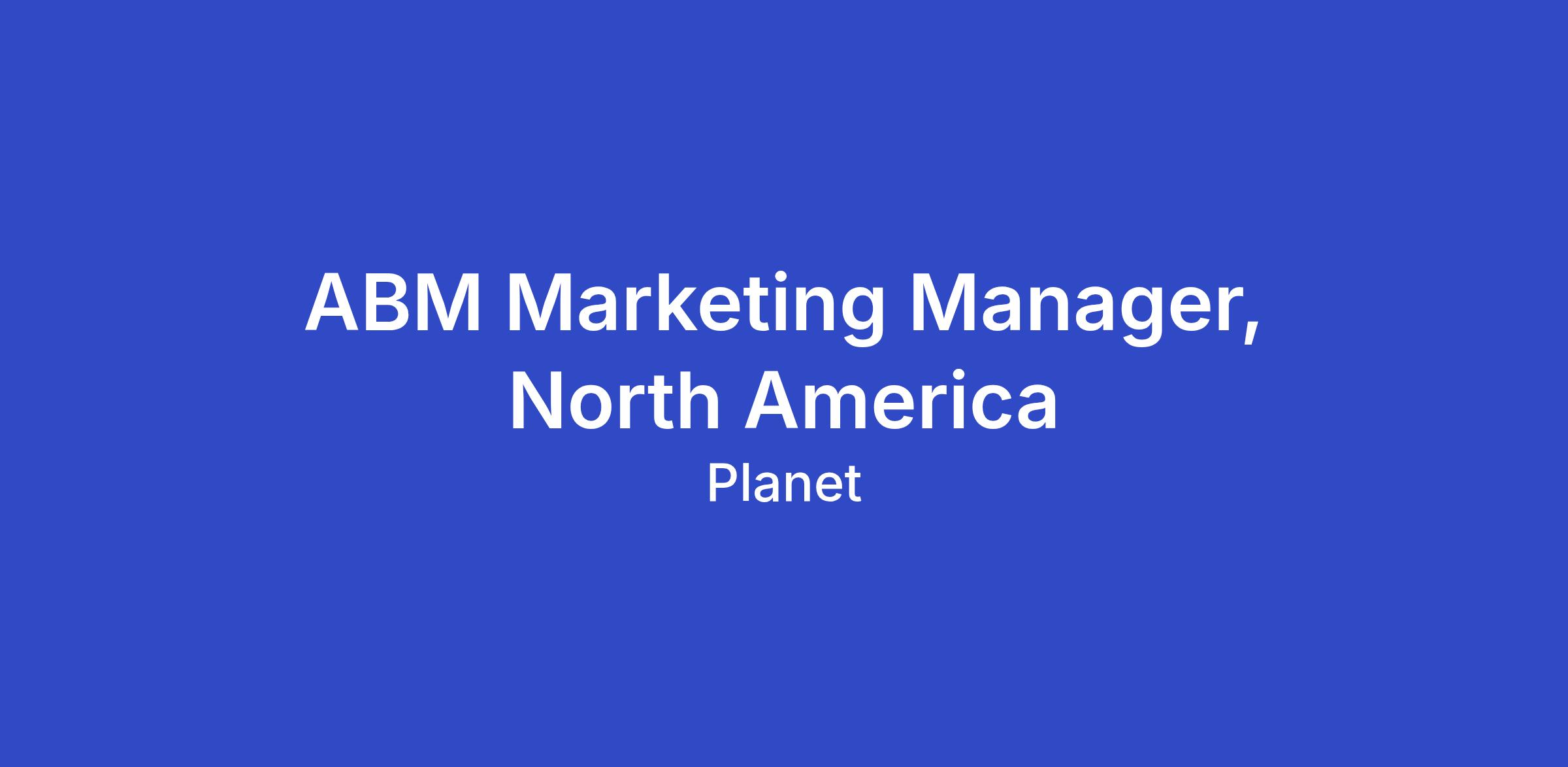 Planet is looking for a passionate, innovative ABM Marketing Manager to lead our marketing efforts for the North America Civil Government business. Reporting to the Sr. Regional Marketing Manager, you will lead the strategy and execution of the account-based marketing (ABM) programs to accelerate pipeline and drive engagement within our priority accounts.