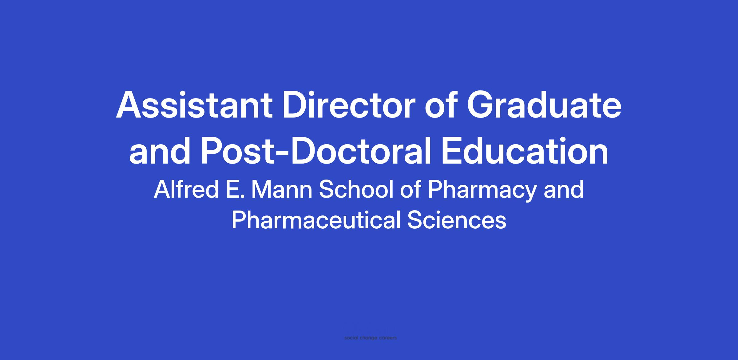 The USC Mann School of Pharmacy and Pharmaceutical Sciences is seeking an Assistant Director of Graduate and Post-Doctoral Education to join its Graduate Affairs Office team. The Assistant Director will be integral to the provision of professional counseling, advisement, and support to students for the Graduate Affairs Office at the Mann School of Pharmacy and Pharmaceutical Sciences. These activities will occur under the direct supervision of the Associate Director of Graduate Affairs and will involve extensive interaction with other key personnel within in the School and throughout USC.