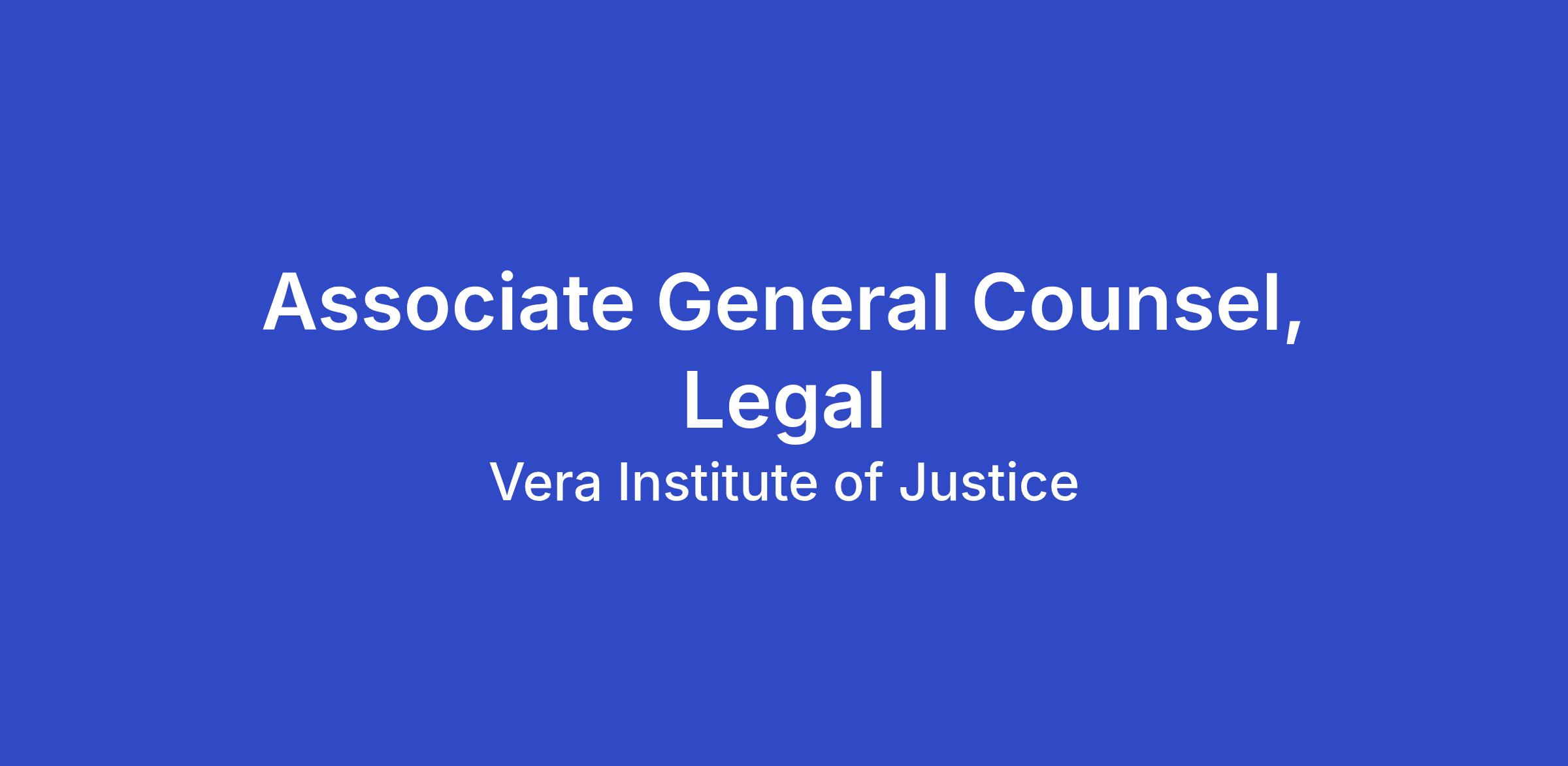 Vera's Legal Department provides comprehensive in-house legal services to the organization, including each of its administrative departments, initiatives, and projects, and to its Board of Trustees. With a creative and problem-solving orientation, the team advises staff of Vera and Vera Action, an affiliated 501(c)(4) organization, on federal, state, and local requirements and works to develop structures and processes that support compliance without compromising strategy. The Associate General Counsel will report to the Chief Legal Officer (CLO) and will work with the entire Legal Department team (consisting of the CLO, the Deputy General Counsel (DGC), the Associate Director for Legal Operations, and the Clifford Chance Foundation Fellow) to keep pace with the work of an ambitious, mission-oriented organization.