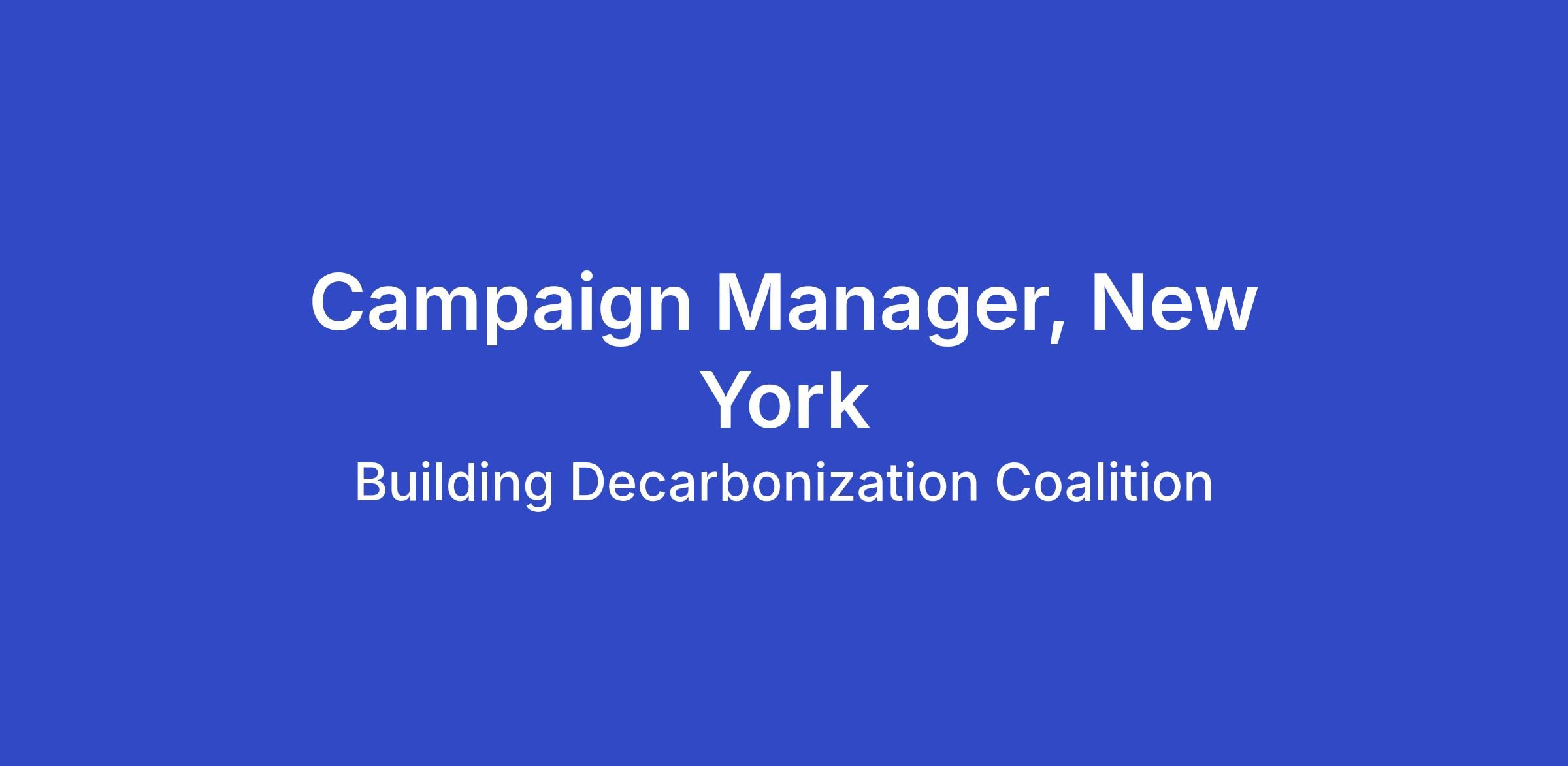 The Campaign Manager plays a key role in advancing BDC’s work in New York. Reporting to the New York Director, this role helps design and implement campaigns that advance building decarbonization policies at the local and state levels.