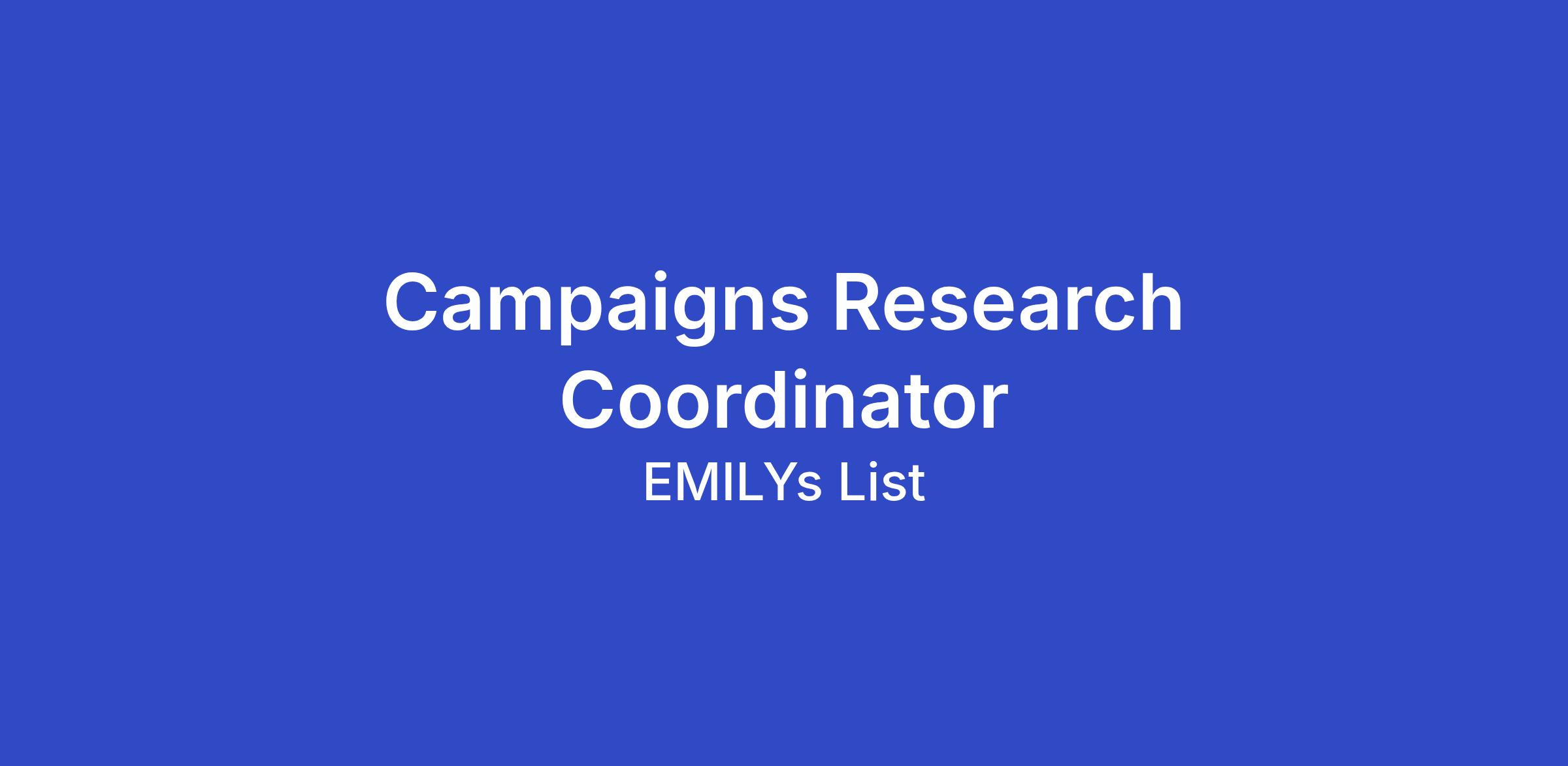 EMILYs List, the nation’s largest resource for women in politics, is searching for a Campaigns Research Coordinator to join our Campaigns team. The Research Coordinator’s primary responsibilities will be to aid in long-term as well as rapid response projects for campaigns research needs.