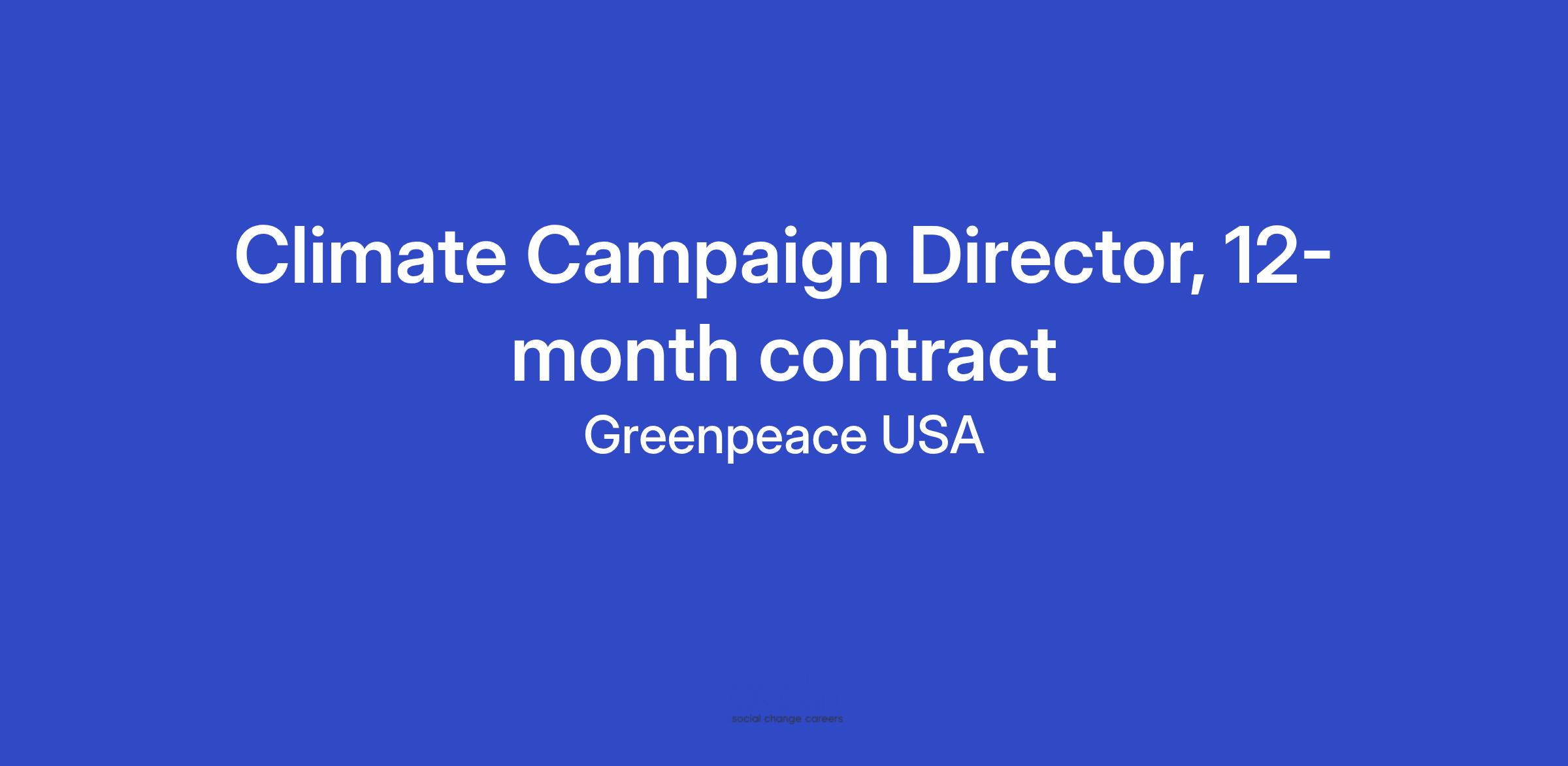 The Climate Campaign Director, 12-month contract is a full-time, exempt, benefits-eligible, hybrid, contract position, with a preference for being based in Washington D.C. Location and time zone in one of our authorized Greenpeace locations (CA, DMV, NY Metro) may be negotiable. This role will report to the Program Director.