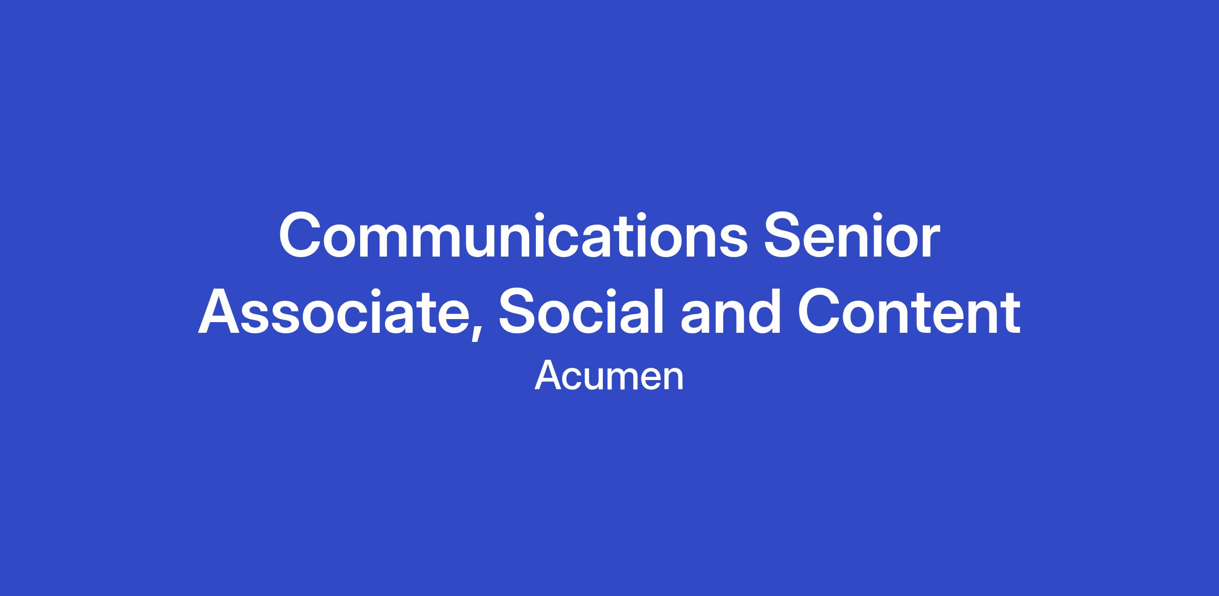 The Communications Senior Associate, Social & Content supports the day-to-day communications work around Acumen’s CEO, helping shape and activate her voice across digital channels while also contributing to general research, planning and communications tasks.
