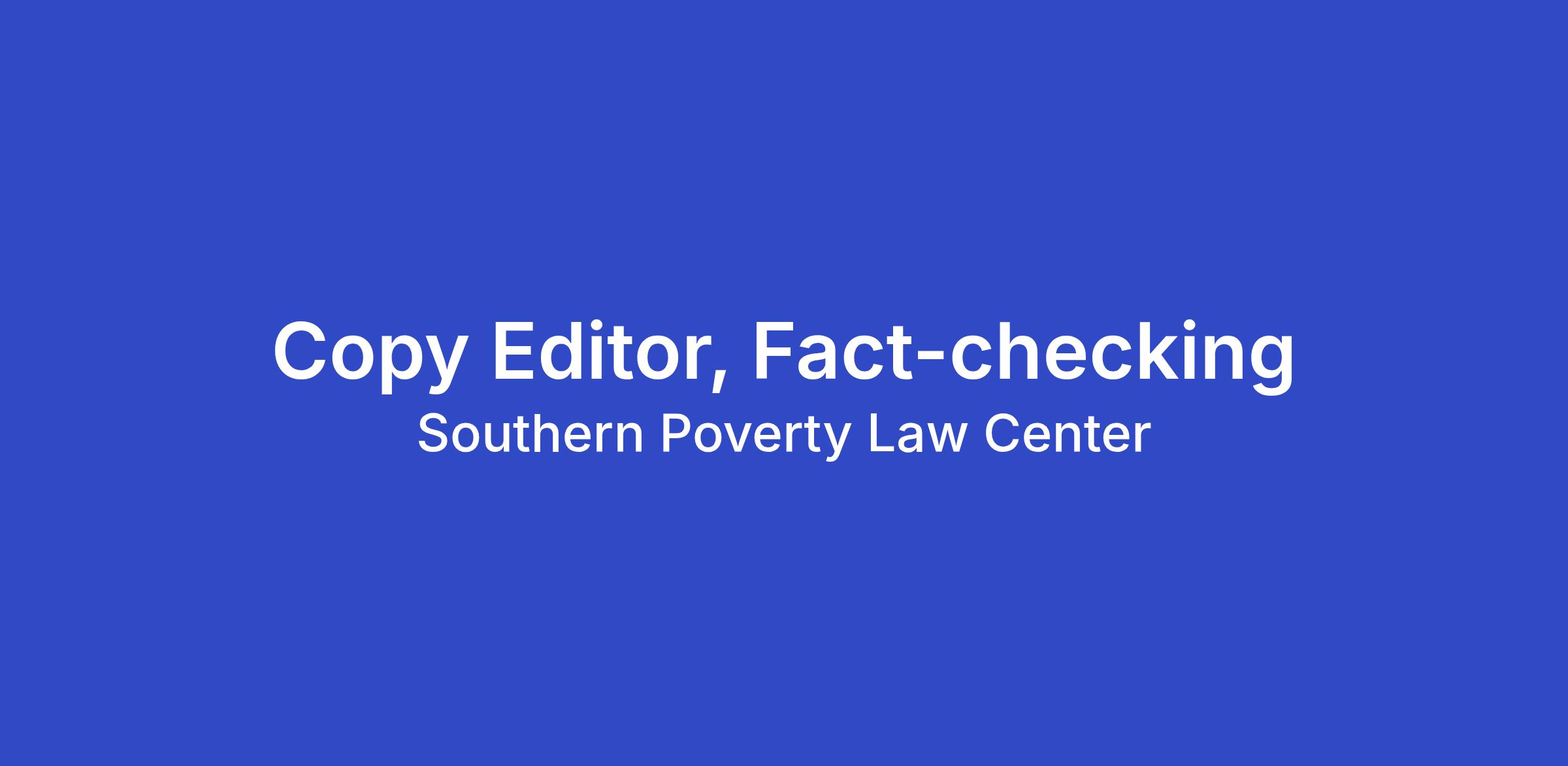 The Copy Editor, Fact-checking is responsible for verifying the accuracy of SPLC content to further the Southern Poverty Law Center (SPLC)’s mission and goals. This position is a copy editor with a primary focus on thorough, accurate fact-checking.