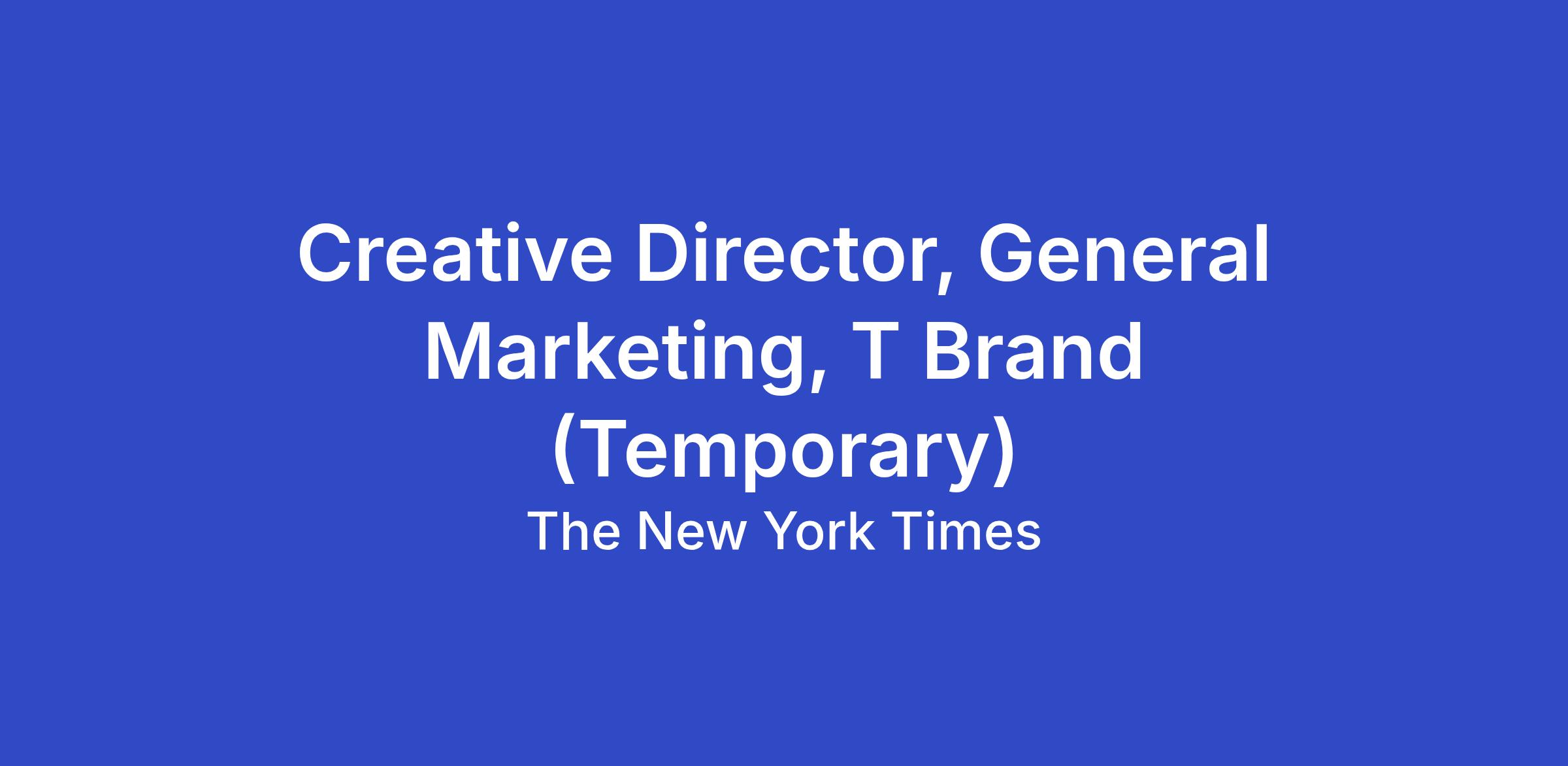 This Temp Creative Director will play a pivotal role in shaping branded storytelling for T Brand's most important General Market advertising categories, including CPG, travel, spirits, retail, services, entertainment and more.