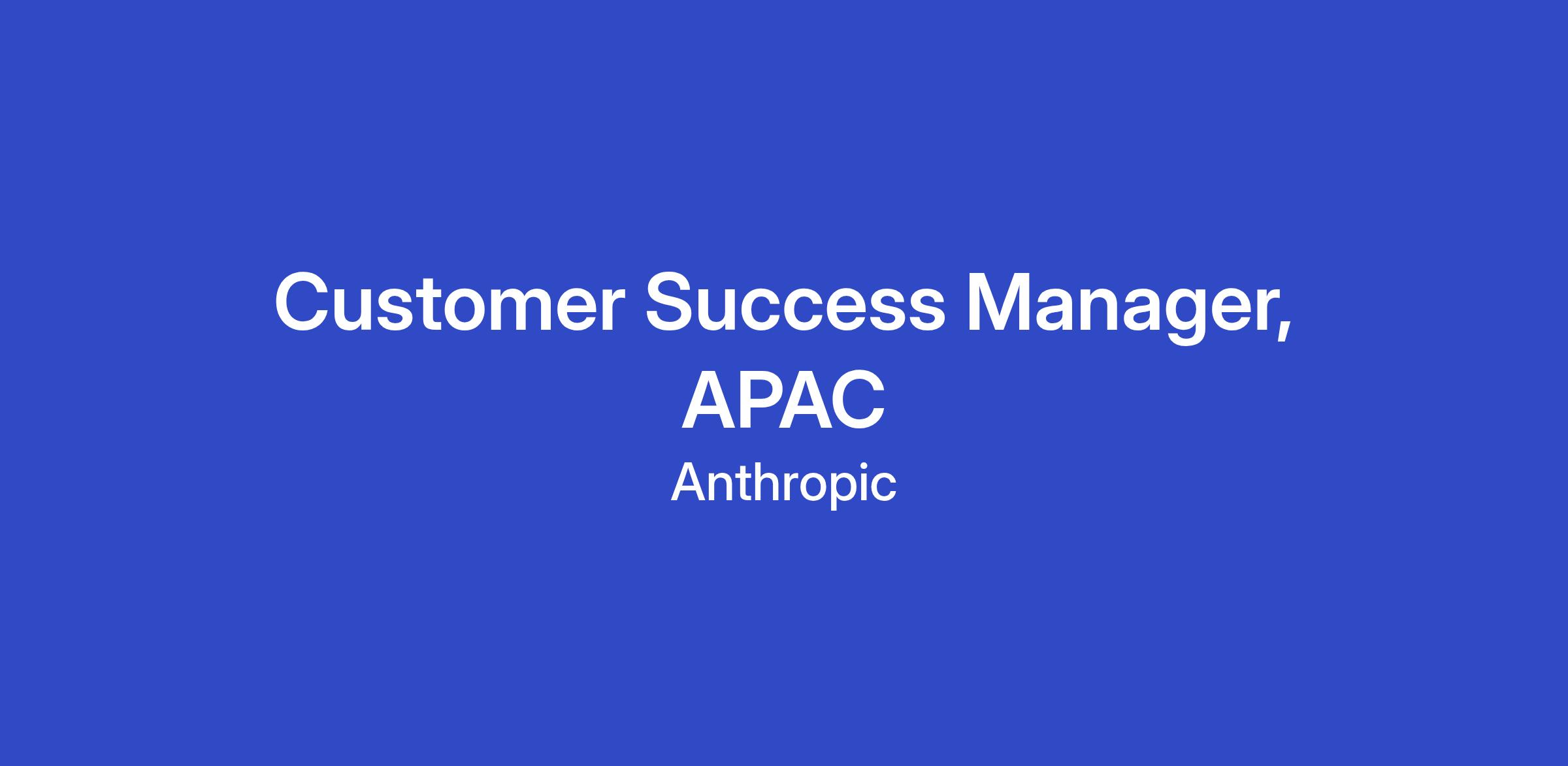 Join Anthropic's Customer Success team as our first APAC-based Customer Success Manager as we pioneer the future of enterprise AI adoption. As a Customer Success Manager at Anthropic, you'll be the strategic partner and trusted advisor to our most complex customers across Asia-Pacific  helping them harness the full potential of all our Claude capabilities - API, Claude for Enterprise, and Claude Code.