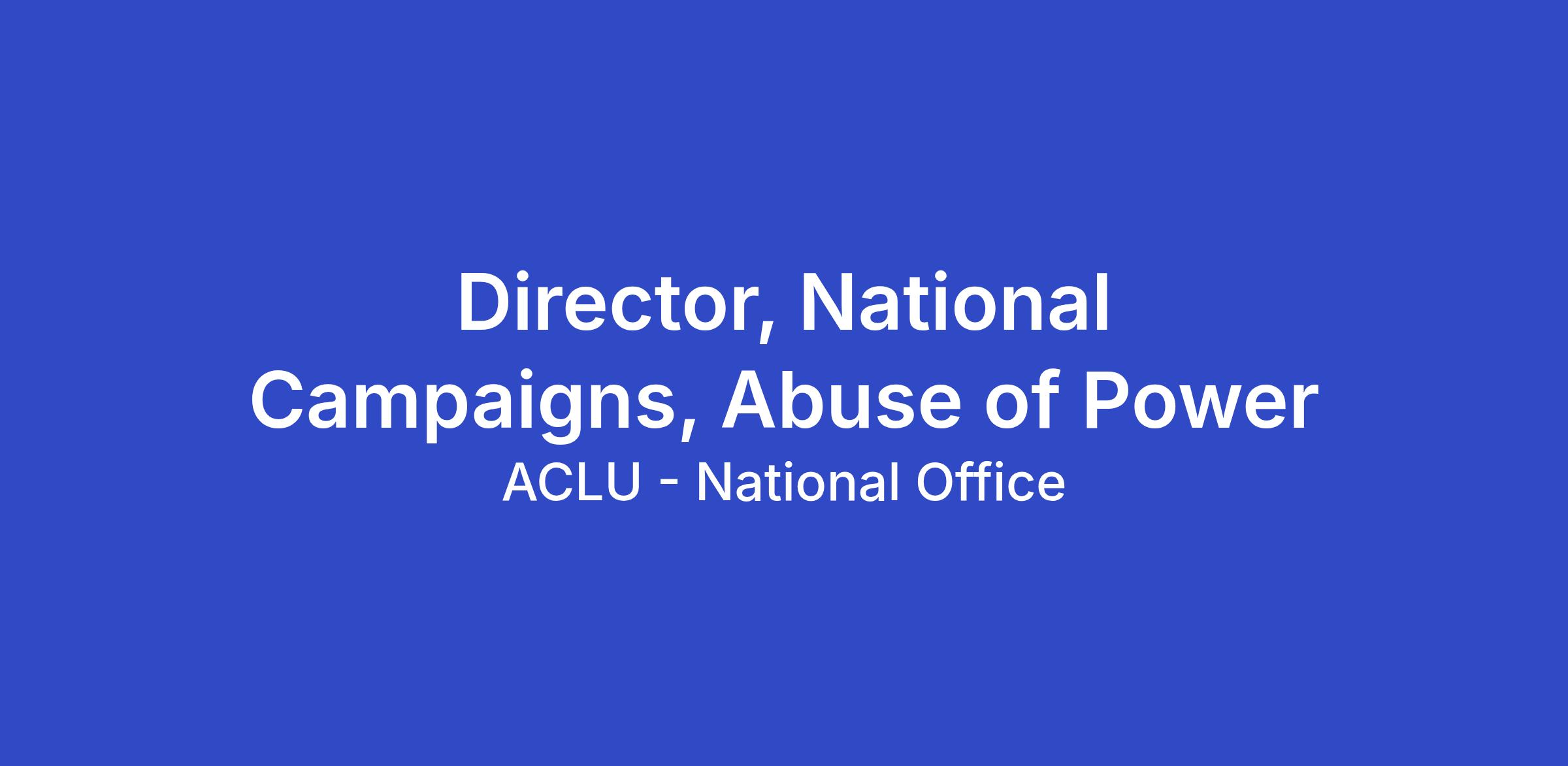 The ACLU seeks applicants for the full-time position of Director, National Campaigns, Abuse of Power in the National Political Advocacy Department of the ACLU’s National office in Washington, D.C. This is a hybrid role that has in-office requirements of two (2) days per week or eight (8) days per month.