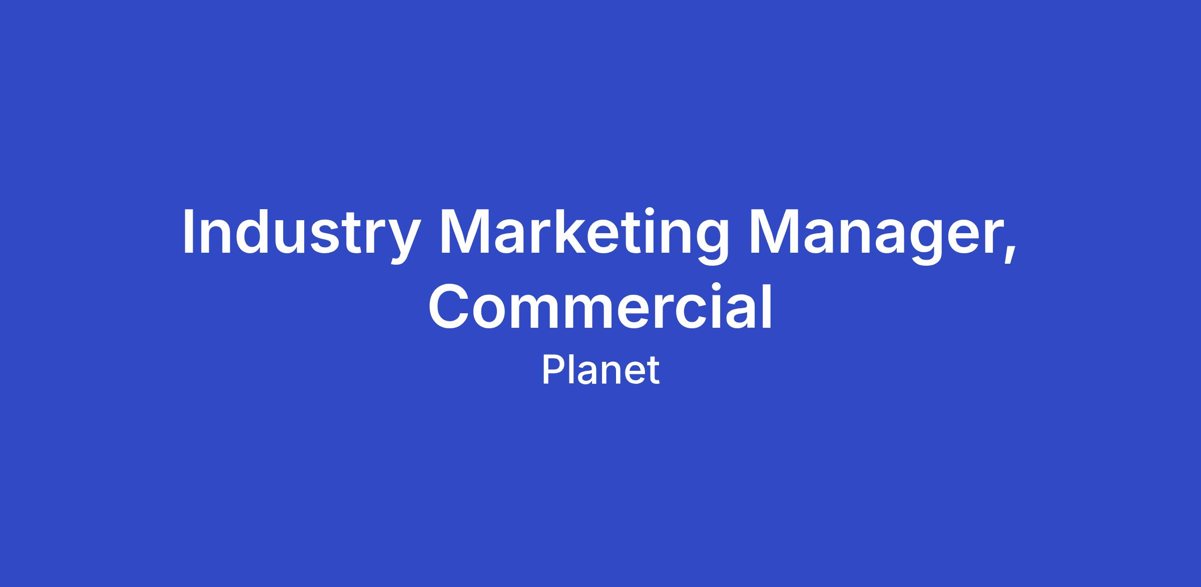 Planet is looking for a strategic Industry Marketing Manager to help grow our commercial business. In this role, you will work closely with stakeholders from across the global commercial business group to drive demand for our products and solutions among industry audiences worldwide.
