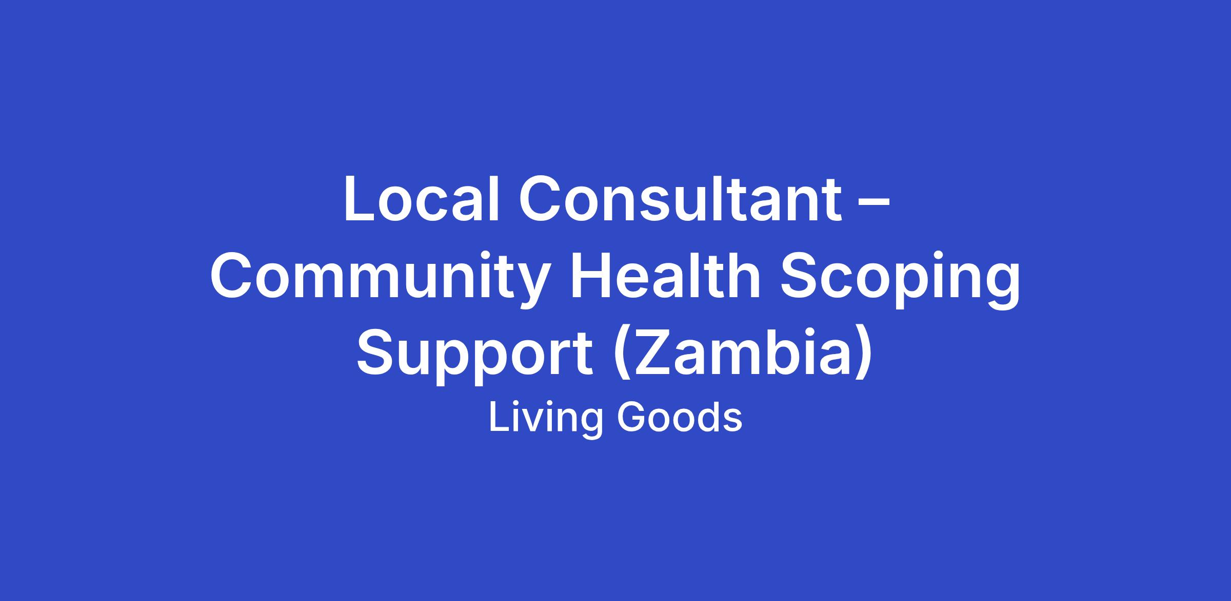 Department: ProgramAbout Living Goods:We’re on a mission to ensure no woman or child dies from easily preventable diseases. To bring high-quality healthcare door to door, we’ve partnered with African governments to ensure that community health workers (CHWs) have the tools, support, and knowledge they need to save lives. We focus on ensuring CHWs are treated as essential health workers who should be digitized, equipped, supervised, and compensated—so they can make the greatest impact—and harness community-level data to transform health systems. Currently, we have supported over 12,000 CHWs, impacting more than 6 million people across Kenya, Uganda, and Burkina Faso.The Opportunity:Living Goods is expanding the portfolio of Countries it is operating in and will conduct a scoping mission to validate findings in the early-stage scoping that was conducted, in which Zambia was shortlisted. This will be a 3 months’ consultancy that will require on the ground opportunity scoping in Zambia to assess whether the Country indeed represents a viable and strategic opportunity for Living Goods entry. This will include the community health landscape, policy environment, stakeholders, and implementation context, etc. as will be detailed in the Scope of work. The local consultant will be engaged in Zambia to provide technical, institutional, and operational support to ensure high-quality contextual analysis and effective engagement with national and sub-national stakeholders. The objective is to support the scoping team in collecting relevant documentation, mapping key actors, facilitating stakeholder engagement, enabling in-Country visits, and contributing substantively to the scoping report and recommendations.Roles and Responsibilities:Documentation and desk review (20%)- Review Living Goods’ early-stage scoping assessments (stage 0 & 1) to validate the initial findings.