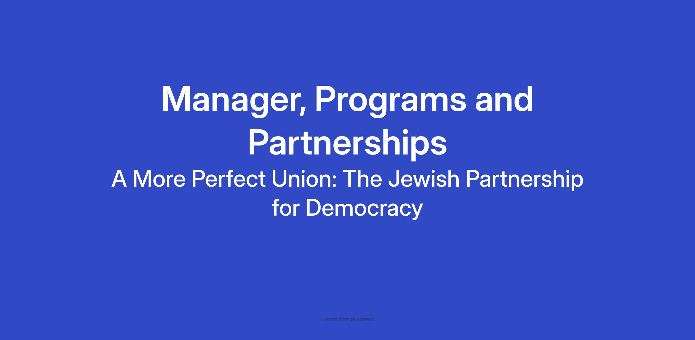 The Manager, Programs and Partnerships designs, implements, and evaluates high-quality programs and resources that empower Jewish organizations to drive civic renewal in their communities. The Manager cultivates and manages relationships with Jewish organizational partners by recruiting new members to the Jewish Partnership for Democracy (JPD), conducting regular outreach to provide support, and identifying opportunities for civic learning and action. This role strengthens connections among JPD partners, as well as between partners, local communities, and the broader pro-democracy field. The ideal candidate brings proven expertise in program design and execution and facility working with data to inform decision-making. As an essential thought partner in all aspects of A More Perfect Union’s civic renewal work, the Manager collaborates closely across teams to keep program functions integrated, efficient, and aligned.