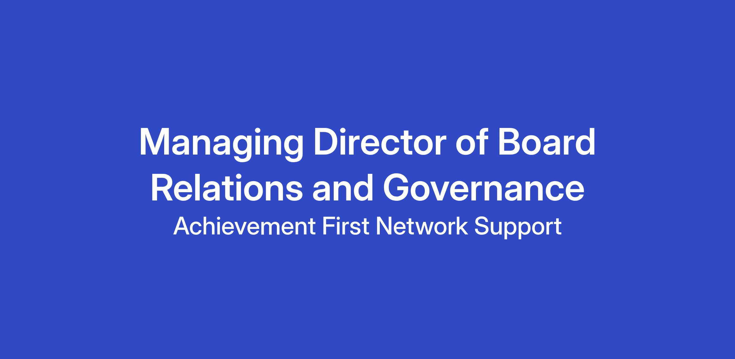 The Managing Director of Board Relations and Governance will be responsible for developing and upholding the standard of excellence for board governance across the Achievement First Network. This role will establish, continuously improve, and uphold all board governance processes and policies that support Achievement First’s seven network support and regional boards. This role is a strategic partner to the CEO, Regional Leaders, and the Executive Team, helping to develop the multi-year organizational story arc to ensure that each board has insight into the effectiveness of AF’s program and schools and internalizes organizational progress. This role will ensure that there is strong cohesion across all seven boards by establishing a clear vision, processes, and systems for strong, effective, and compliant board governance, while still ensuring space for responsiveness to local needs and opportunities within each region. As Achievement First evolves into a regionalized operating model, the MD of Board Governance and Relations will partner with regional leaders, developing the tools and training that the Regional Executive Directors and the Regional MD of External Affairs will need to ensure AF has strong governance across all of AF’s regions. The Managing Director role is a strategic one that is charged with ensuring that Achievement First boards continue to develop into high functioning non-profit boards, while also requiring a high degree of project management skills to manage multiple priorities and collaborate closely with many stakeholders. Reporting directly to the Chief Strategy Officer, your responsibilities will include: