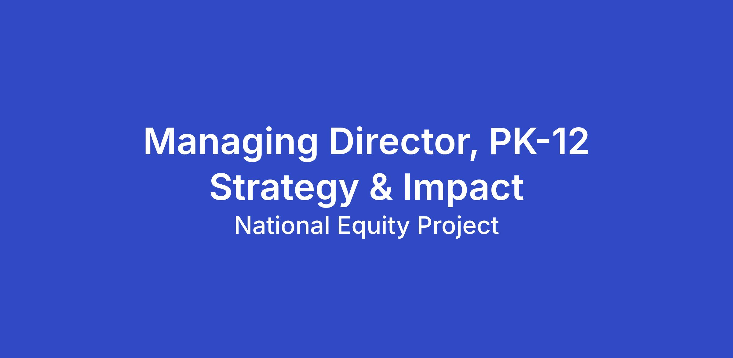 In 2025, the National Equity Project (NEP) launched an ambitious decade-long strategy to transform educational experiences for 5 million young people nationwide. We are seeking a Managing Director of PK-12 Strategy & Impact to lead our direct services work with leaders and education systems into this next chapter of NEP's history. This full-time role is responsible for developing and executing a comprehensive strategy that drives NEP's programmatic growth in reach, impact, and revenue with school systems and education organizations that NEP works directly with to build the leadership practices and system conditions that cultivate learner-centered environments for young people.