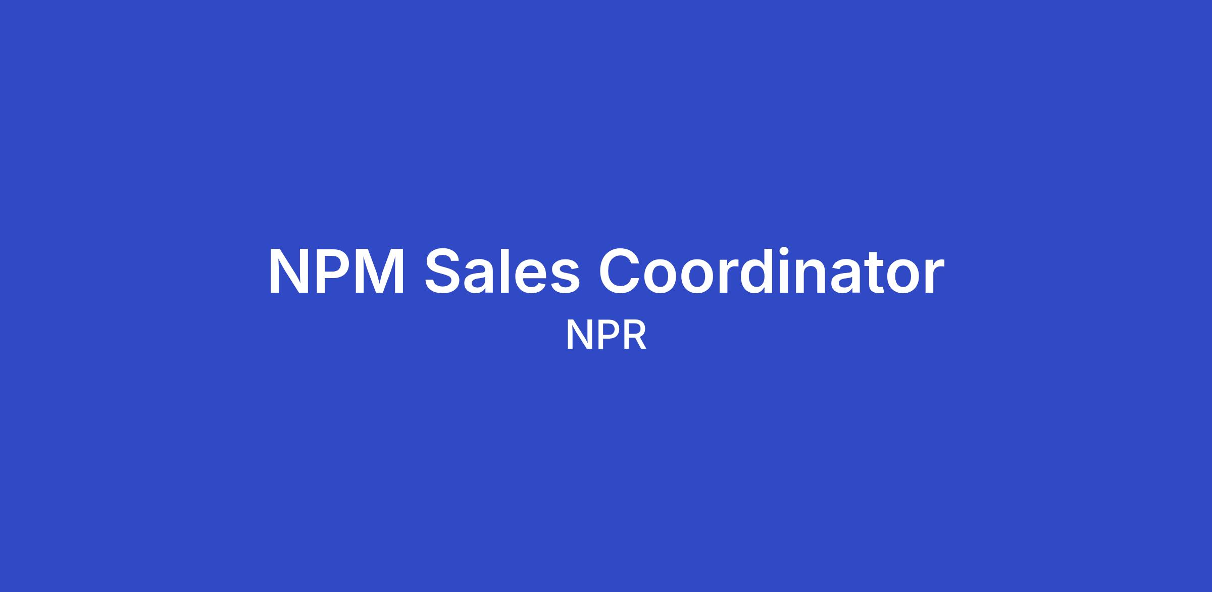 National Public Media is looking for an experienced sales coordinator to join our Midwest, Chicago NPR sales office. The sales team represents NPR’s radio, podcast, digital and events platforms. The ideal candidate has experience working in a fast-paced media sales or advertising agency environment, is curious about the media industry, detail-oriented, able to multi-task and has a proven ability to thrive under pressure.