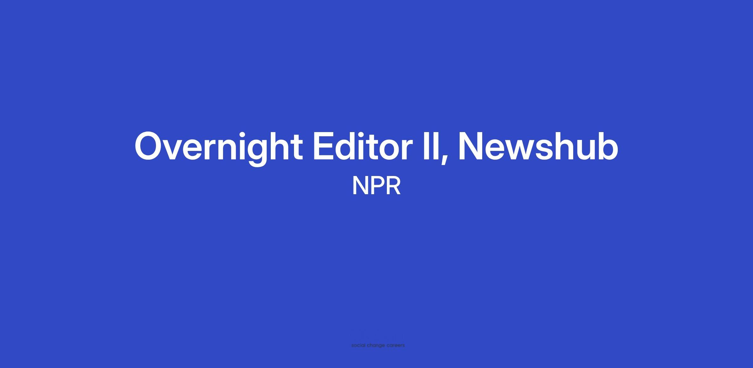 This editor is a member of the NPR Newsroom’s overnight team and reports to the Newshub Supervising Overnight Editor. The editor is responsible for editing news stories with NPR reporters for the UpFirst Podcast and Morning Edition Broadcast. The editor will also work with the Supervising Overnight Editor and help decide what stories to cover on our digital platforms overnight. They will commission, edit and sometimes write stories. They will regularly collaborate with various newsgathering teams and look for ways to spark signature NPR journalism from across our network. The overnight editor will also substitute for the Supervising Overnight Editor as needed.
