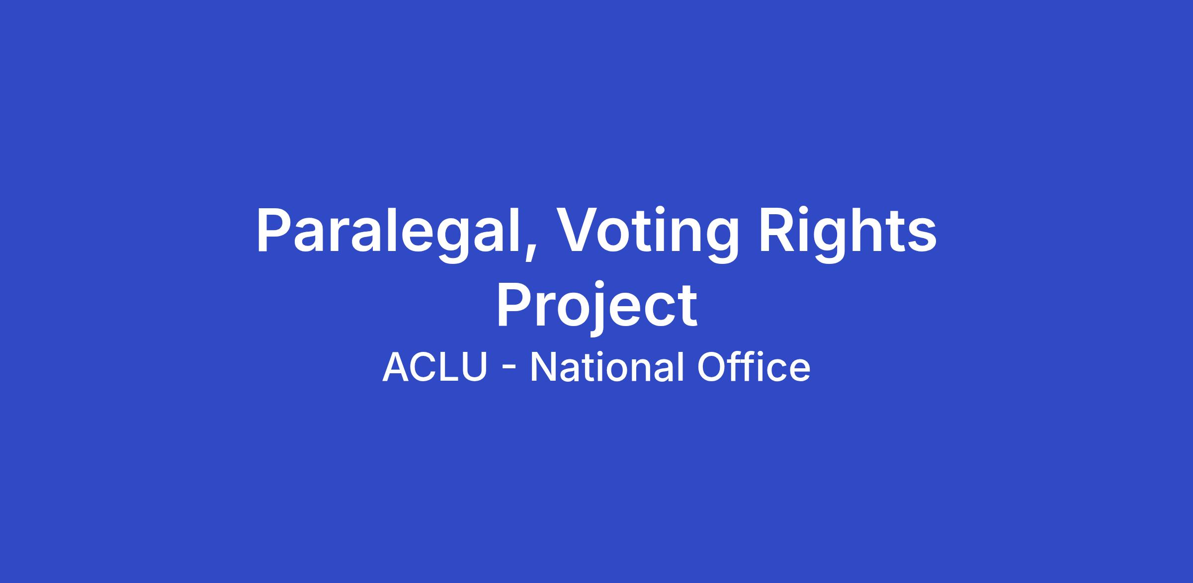 The ACLU seeks applicants for the full-time position of Paralegal in the Voting Rights Project (VRP) of the ACLU’s National office in New York, NY. This is a hybrid role that has in-office requirements of two (2) days per week or eight (8) days per month.