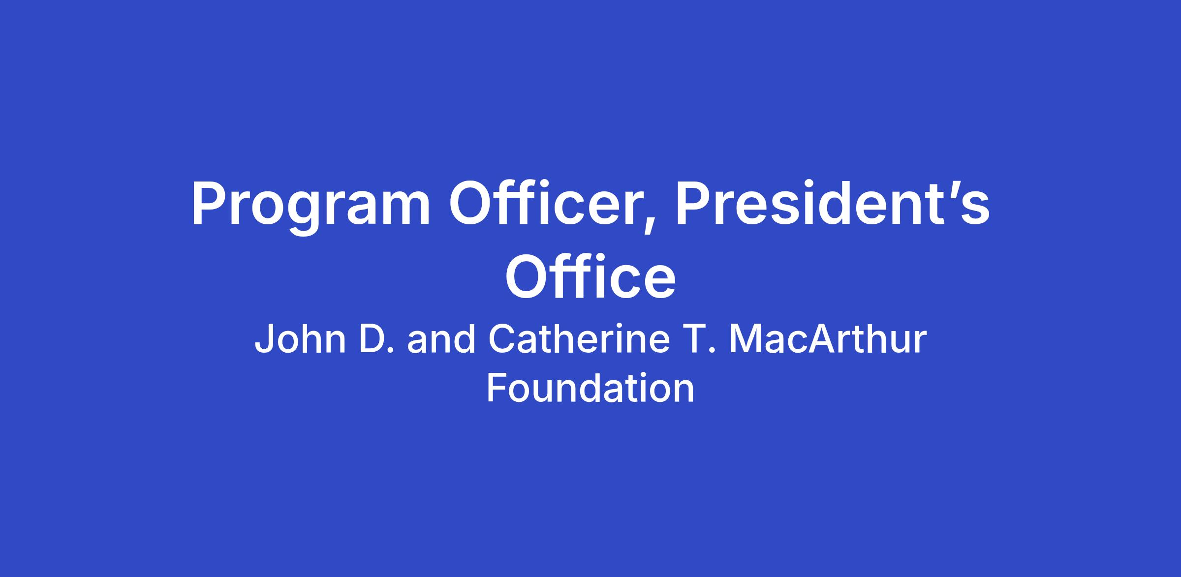 The Program Officer, President’s Office, works with the team’s Director and colleagues to ensure the strategic, effective and efficient implementation of grantmaking and special initiatives sponsored by the office. The Program Officer will be called upon to produce, sometimes under pressure, and consistently deliver high-quality work. They must have the gravitas to represent the President well and the ability to build effective relationships internally and externally. This person must be able to move grants and initiatives from concept through implementation, taking initiative, displaying leadership, collaborating with others, anticipating potential issues, and proposing creative solutions. The Program Officer is expected to be highly skilled in strategy and program development, planning, organization, and project management. All President’s Office team members serve as extensions of the President, holding the highest standards and executing with rigor and intention.