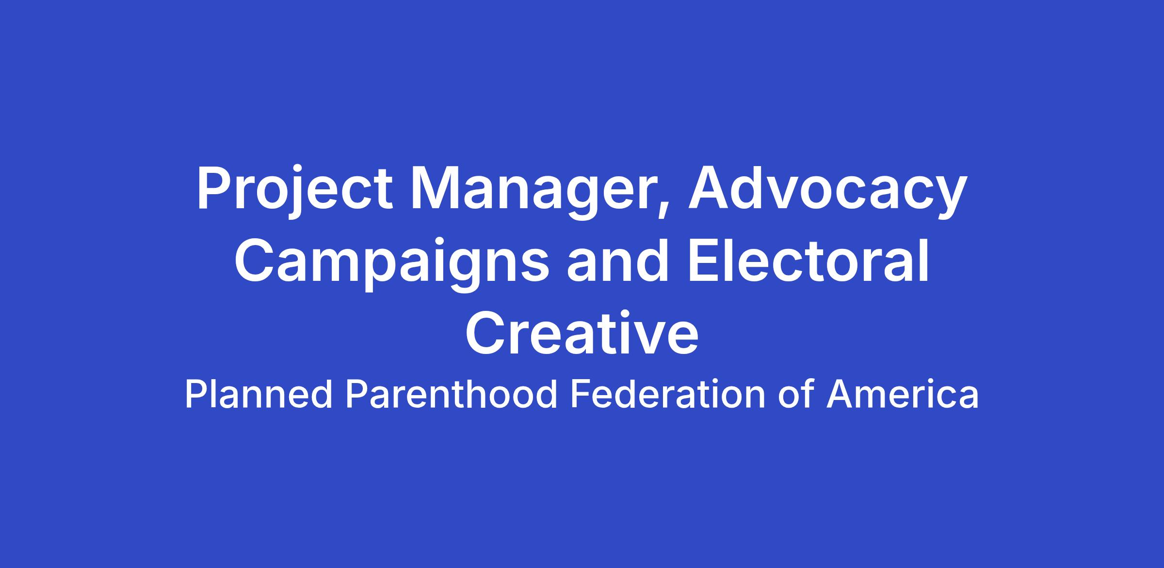 Planned Parenthood Federation of America (PPFA) and Planned Parenthood Action Fund (Action Fund) seek an Advocacy Campaigns & Electoral Creative Project Manager to support PPFA and Action Fund’s advocacy and issue campaigns operations, and Action Fund and PPVotes electoral program operations leading up to and during the 2026 electoral cycle. This job reports to the Associate Director, Brand Operations on the Brand Team. The Brand Team works to set unified brand strategy; determine, prioritize, and engage key audiences; lead and shape brand campaigns, visuals, tone, and storytelling; and ensure adherence to brand standards.