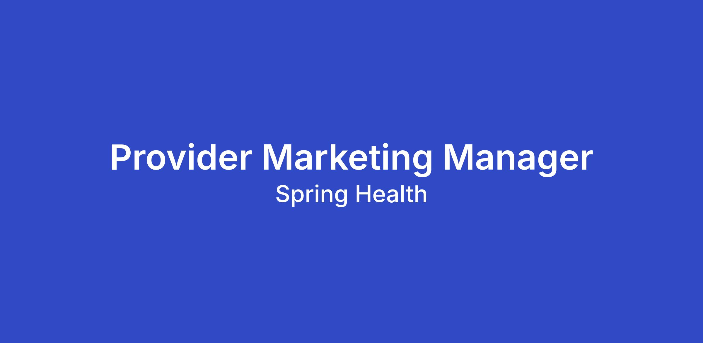 The Provider Marketing Manager will shape and deliver compelling narratives that inform, engage, and inspire Spring Health’s diverse network of mental health providers. This remote role is part of the Marketing team and plays a critical role in communicating the value of new initiatives, deepening provider connection, and ensuring the right message reaches the right audience at the right time. This is a full-time remote position on our team reporting directly to the Engagement Lead, Provider Marketing. Occasional travel may be required for company or team events.