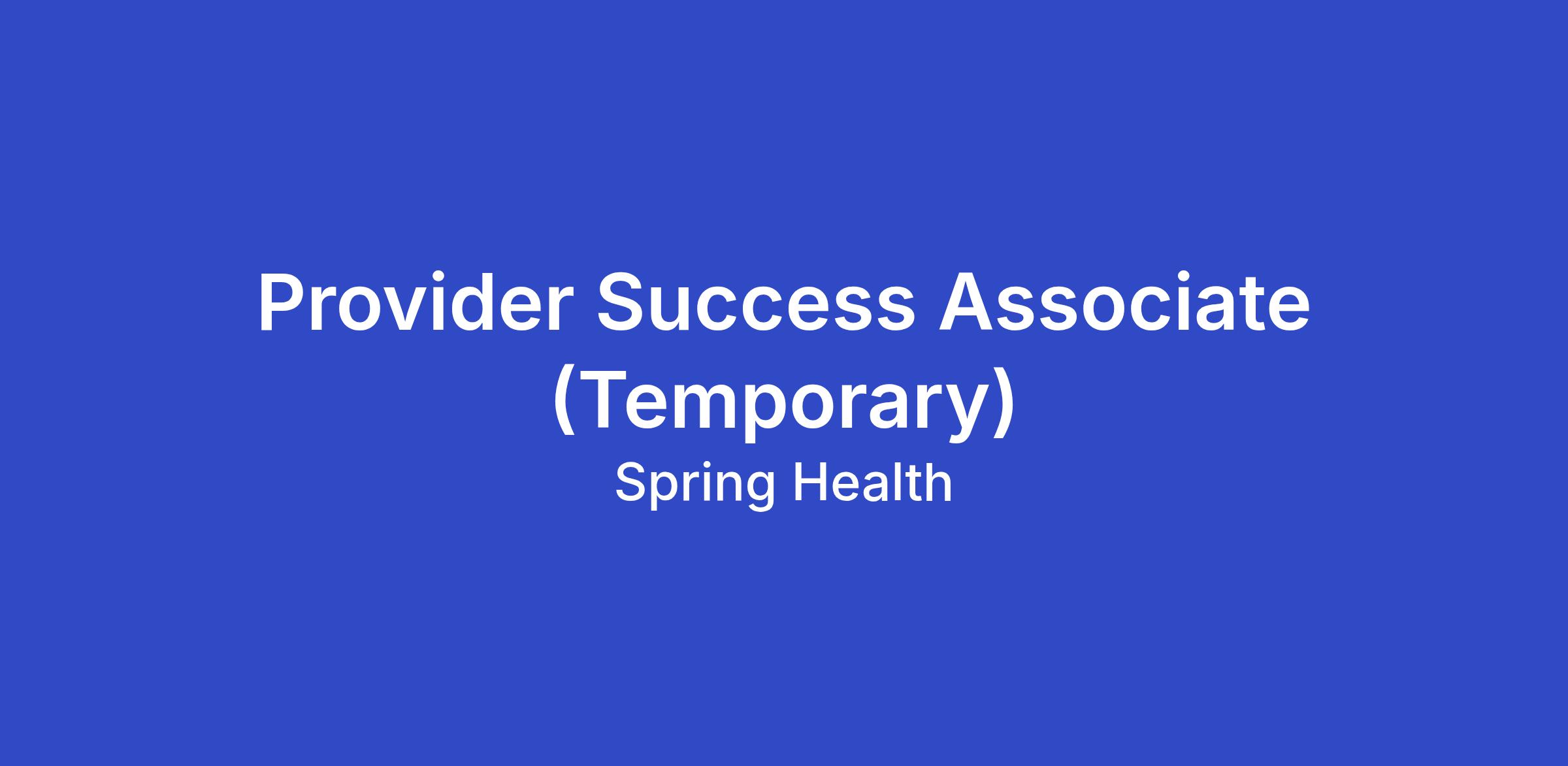 We are seeking a highly motivated Temporary Provider Success Associate to join our Provider Operations team at Spring Health on a three month temporary assignment, with the possibility of extension based on business need. Our mission is to build, retain, and empower the most diverse, high-quality provider community—driving both clinical outcomes and exceptional member experiences. In this role, you will be instrumental in delivering outstanding support to our mental health providers through multiple channels, including email, phone, and live Zoom sessions. Ideal candidates will bring experience in technical, product, policy, and/or pay-related support, along with a strong ability to communicate complex information with clarity and empathy. If you're passionate about fostering an exceptional environment for providers and thrive in a fast-paced, mission-driven setting, we’d love to hear from you. This is a full-time, temporary position on our team and reports to the Provider Success Team Lead. There is no expectation for this position to travel.