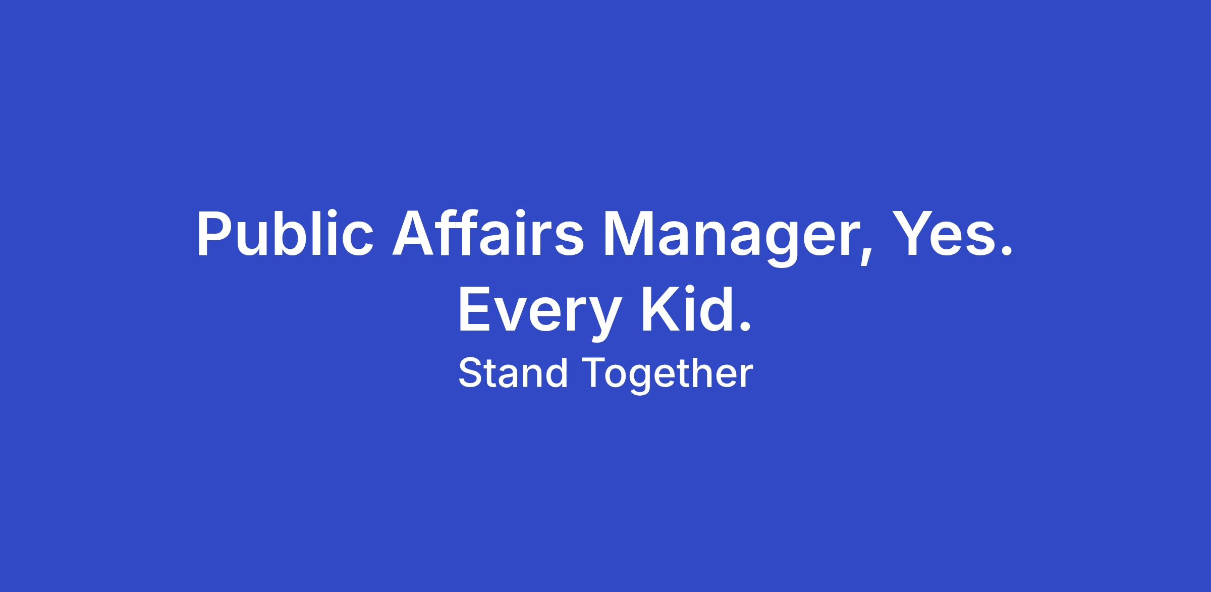 yes. every kid. is seeking an experienced Public Affairs Manager to support our education advocacy and public policy efforts. This role works cross functionally with research, communications, government affairs, and digital teams to advance organizational priorities through research translation, messaging, media support, and digital engagement.
