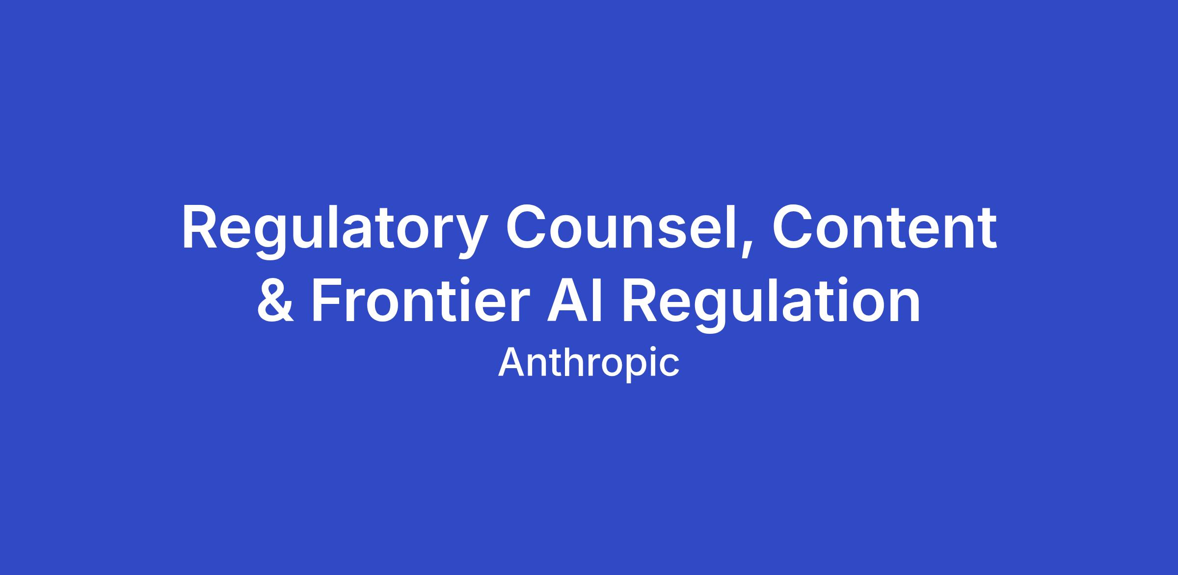 Anthropic is seeking a Regulatory Counsel to lead our legal work on online content regulation globally, and to interface with EU regulators on content regulation and AI regulation. Our international footprint covers some material regulatory regimes affecting Anthropic's business, including the EU AI Act, Digital Services Act, the UK Online Safety Act, and the rapidly evolving online-content regimes emerging across APAC and other international markets.