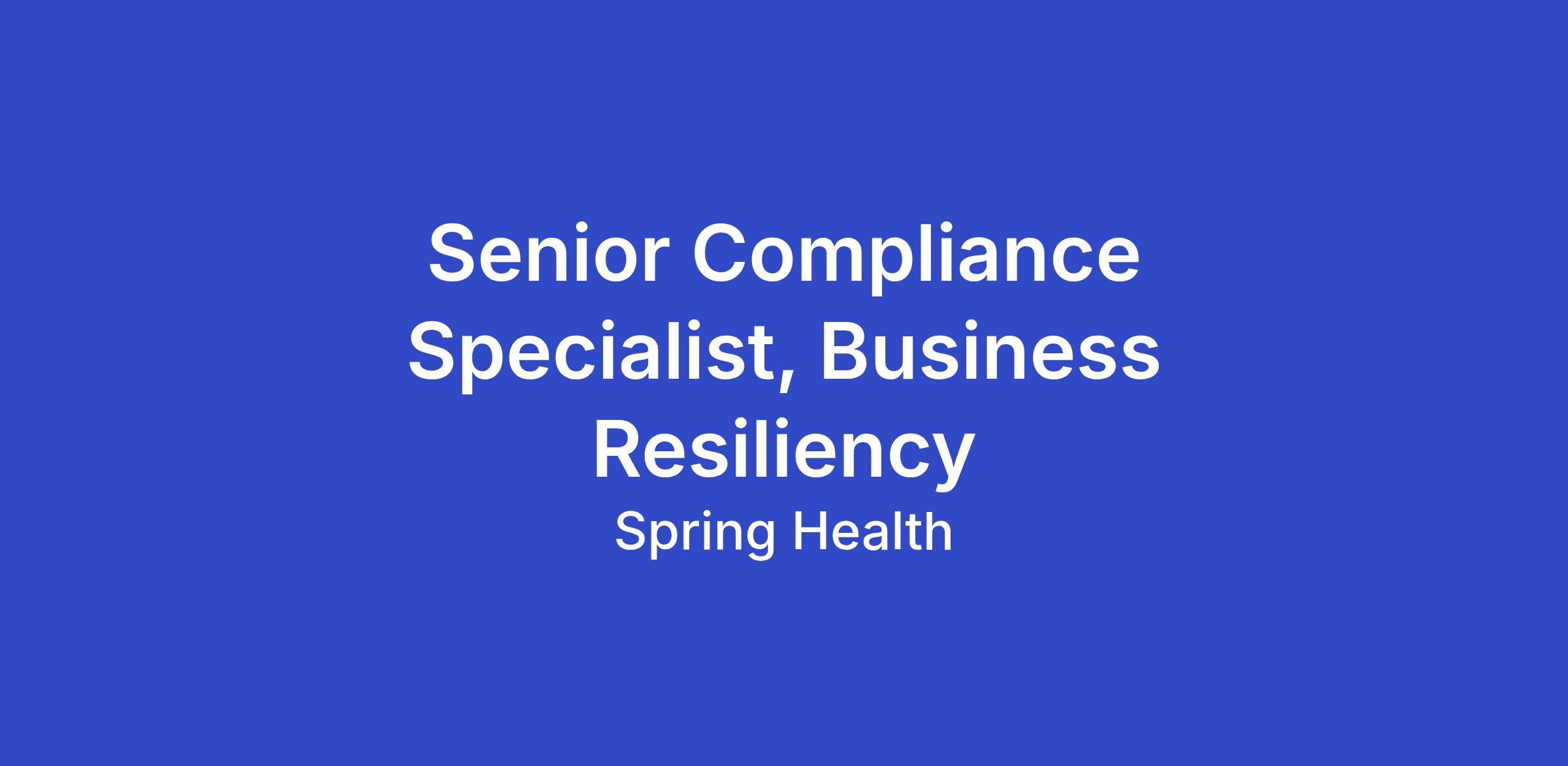 Reporting to the Sr Manager, IT Compliance, the Senior Compliance Specialist, Business Resiliency will support the design, execution, and continuous improvement of Spring Health’s enterprise resilience program. This role partners cross-functionally across all departments and with key vendors to ensure Spring Health can effectively prepare for, respond to, and recover from disruptive events, while meeting regulatory and customer assurance expectations. The Senior Compliance Specialist, Business Resiliency ensures annual BCP/DR and Crisis Management planning, testing, training, and reporting are delivered; enables and coordinates Department BCP/DR Champions and application owners to execute continuity activities; and ensures the enterprise structure (governance, standards, catalog management, and evidence readiness) is defined and operating, in a compliance capacity.