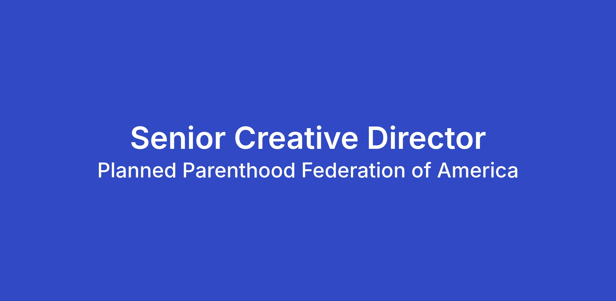 Planned Parenthood Federation of America (PPFA) and Planned Parenthood Action Fund seek a skillful and imaginative Senior Creative Director. This job reports to the National Director, Creative and Video on the Brand Team. The Brand Team works to set unified brand strategy; determine, prioritize, and engage key audiences; lead and shape brand campaigns, visuals, tone, and storytelling; and ensure adherence to brand standards.