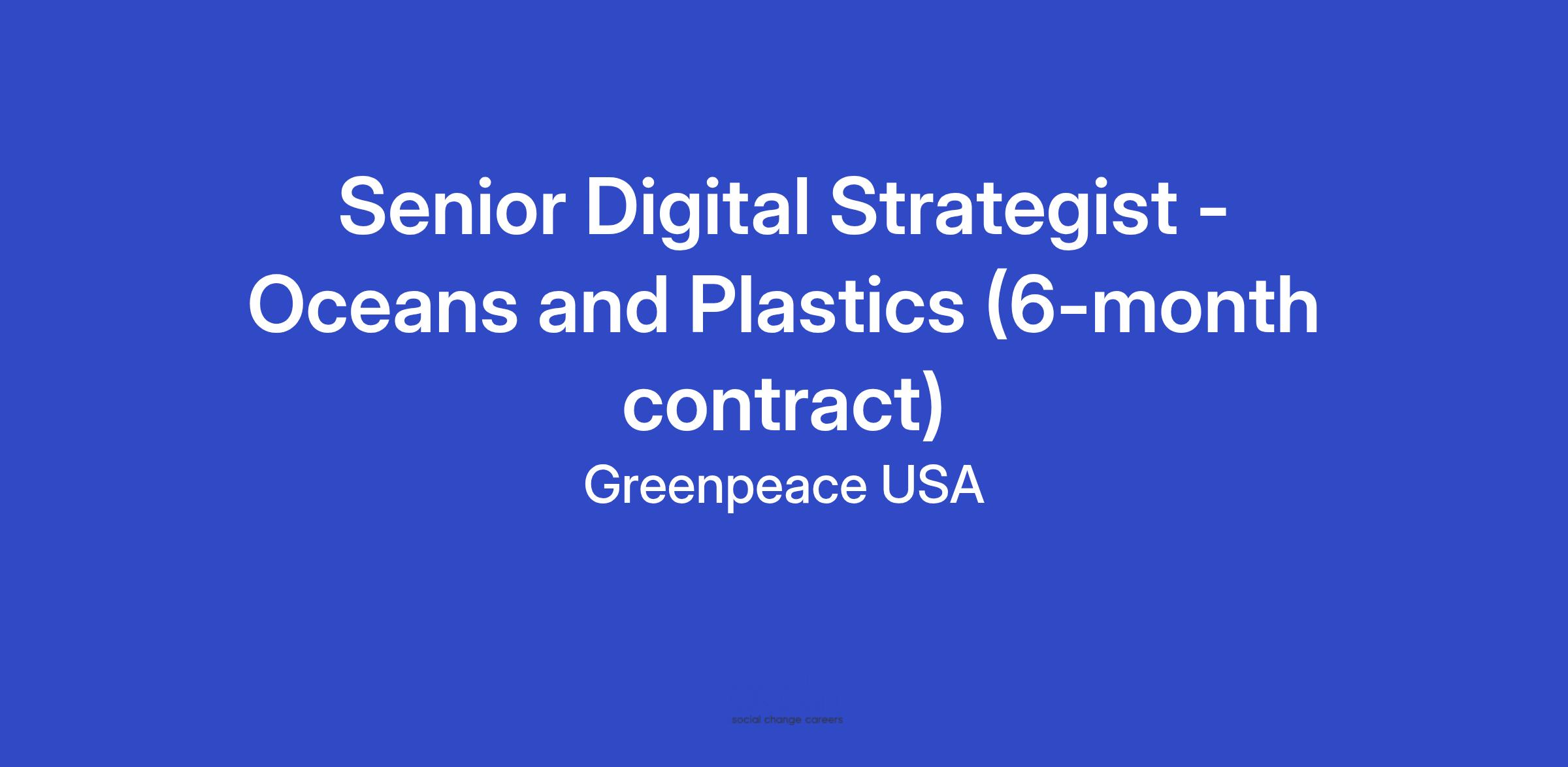 The Senior Digital Strategist - Oceans and Plastics (6-month contract) is an exempt, full-time, benefits-eligible position, based in any GPUS-authorized location (CA, DC, MD, VA,, NY, NJ, CT), and will report to the Digital Campaigns Director.