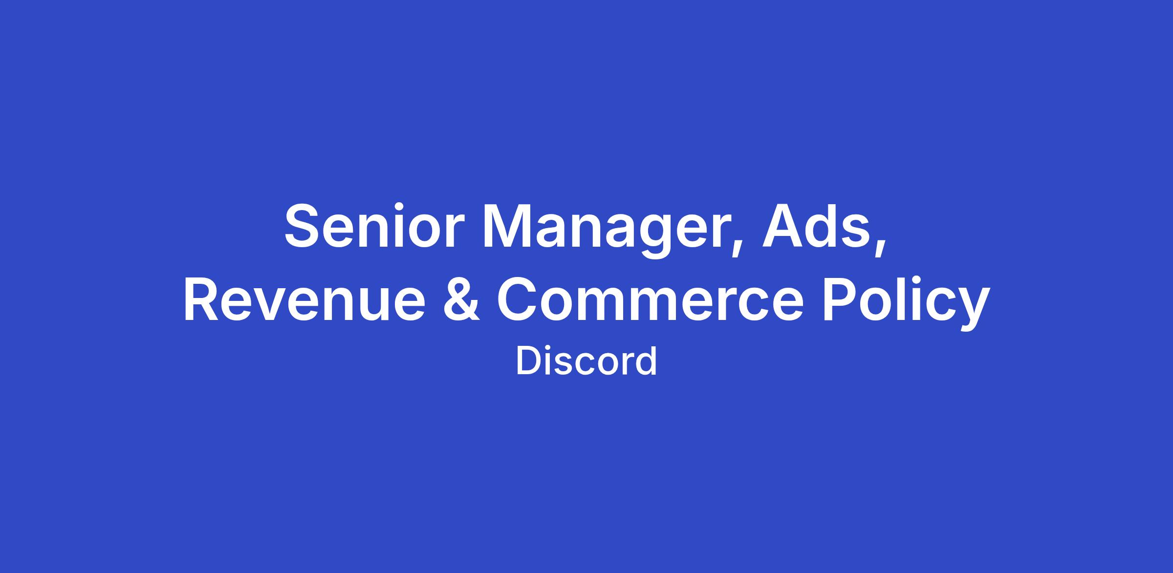 Discord is evolving how we generate revenue whilst staying true to our values of user trust and authentic community connection. As a Senior Manager of Ads, Revenue & Commerce Policy, you'll play a pivotal role in shaping the policies that govern our revenue products — from advertising and Nitro subscriptions to creator revenue, app monetization, and our Developer Policy. You'll be the founding leader of the Ads, Revenue & Commerce Policy team, working at the intersection of business growth, user safety, and brand safety.