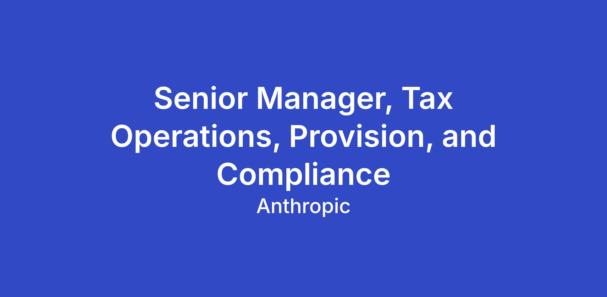 We are looking for a Senior Manager, Tax Operations, Provision, and Compliance to join our Finance & Accounting team at Anthropic. In this role, you will own and manage the company’s global income tax provision process and tax compliance function. Reporting to the Tax Operations, Provision, and Compliance Lead, you will build and optimize our tax infrastructure as we continue to scale rapidly, ensuring accurate and timely tax reporting while navigating the complexities of a high-growth AI company. This role will work closely with the Accounting team, external tax advisors, and cross-functional partners to ensure compliance with all applicable tax regulations and support the company’s strategic financial goals. If you are looking for an opportunity to make a significant impact on the tax function of an innovative company, come join us in our mission to build cutting-edge, safe AI.