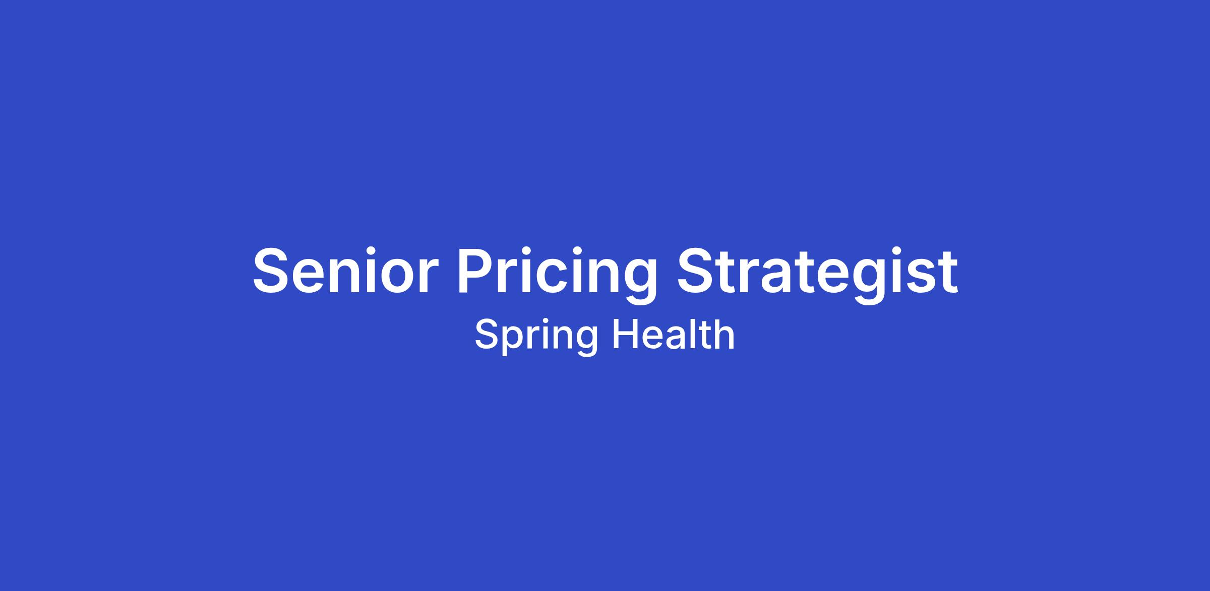 As Senior Pricing Strategist you will play a critical role in shaping Spring Health’s monetization strategy. You will shape how Spring Health translates product value into scalable, market-aligned pricing and packaging constructs. You will partner closely with Product, Revenue, Finance, Actuarial, and PMM to set and execute pricing and packaging strategies that drive improved commercial outcomes, achieve business goals, and deliver real customer value. Reporting to the Director of Pricing & Packaging, this high-impact individual contributor role focuses on forward-looking pricing strategy.