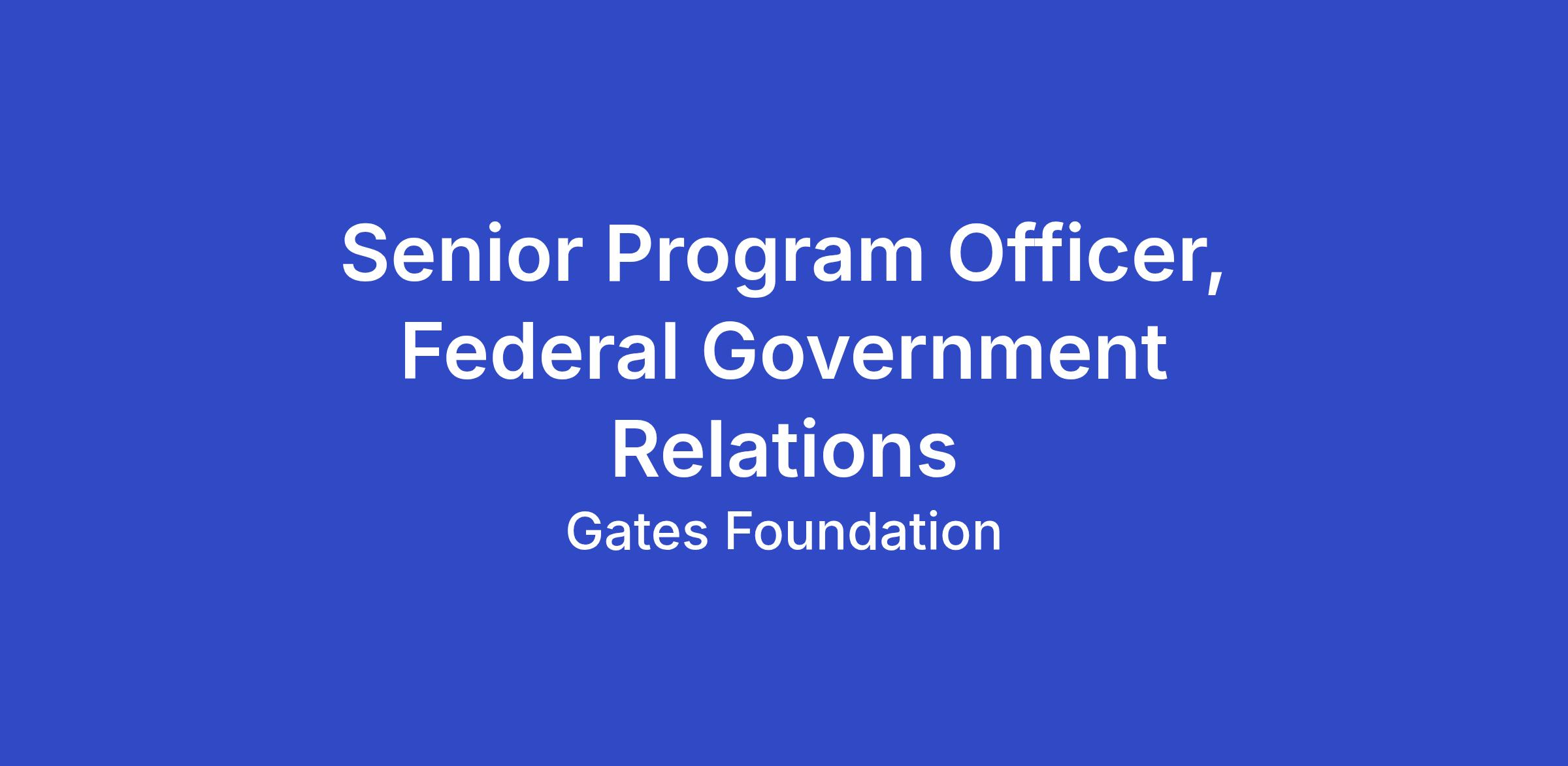 As Senior Program Officer, you report to the Deputy Director, Federal Government Relations in our Washington, DC office. You develop and implement advocacy strategies in coordination with the Federal Government Relations team and manage one or more portfolios of grants to advance key foundation priorities in global program strategy teams. You develop and maintain relationships with key US decision-makers who are directly involved in areas of interest to the foundation. You also have experience working in the US government.
