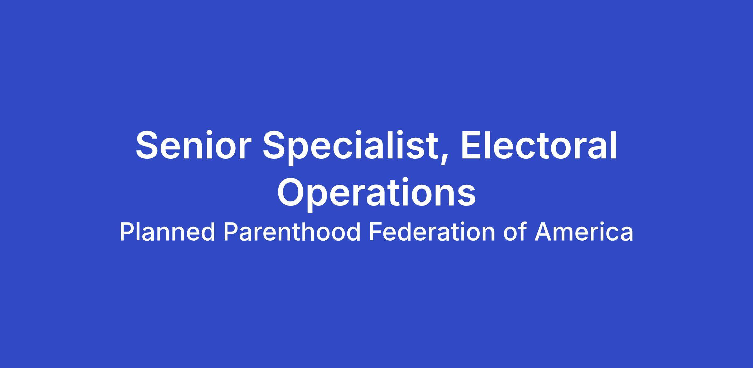 Planned Parenthood Federation of America (PPFA) and Planned Parenthood Action Fund (Action Fund) seek an Electoral Operations Senior Specialist to support Action Fund and PPVotes electoral program operations leading up to and during the 2026 electoral cycle. This job reports to the Director, Strategic Operations in the Office of the Managing Director department of PPFA and is tied to the 2026 Election Cycle. The Office of the Managing Director team is responsible for end-to-end budget development & management, operating strategy, contract and procurement systems (e.g., Coupa), and resource management across the org unit.