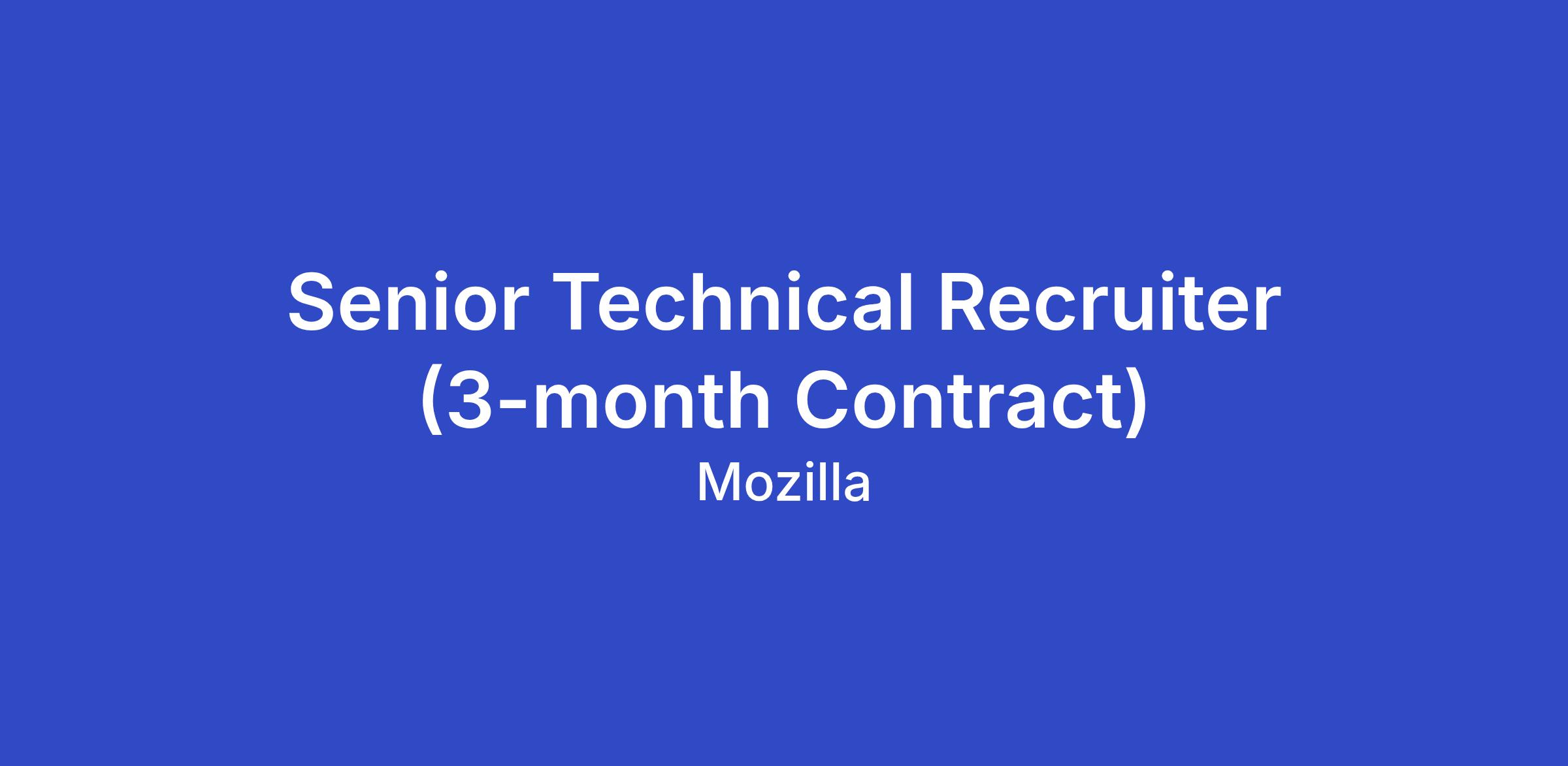 About this team and role:This Recruiter will help grow Mozilla’s global recruiting effort for various Mozilla products. You are joining a team and company at a time of growth and transformation. You will love being surrounded by people who are as passionate as you are about doing their part to make technology, their community, and the world a better place for ALL. This is slated as a 3-month contract.