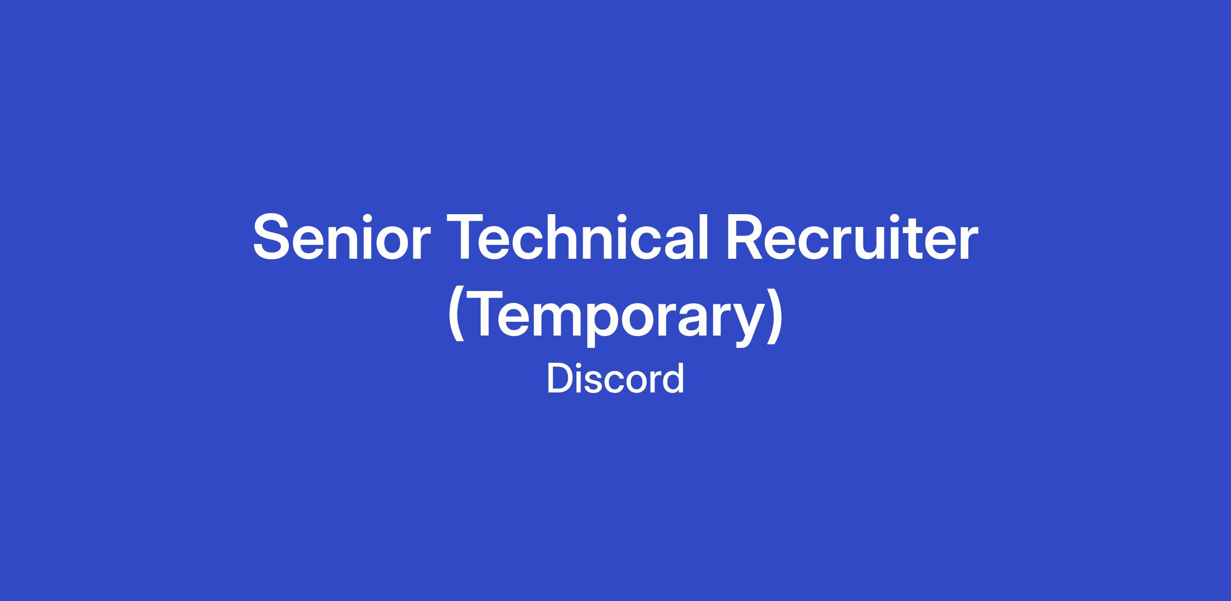 Working at Discord is like working with an exciting and motivated family. Finding the right people to add to our unique mix is a difficult endeavor, so we're looking for a Senior Technical Recruiter to join our recruiting team and help us maintain a smooth and positive experience for remarkable candidates.