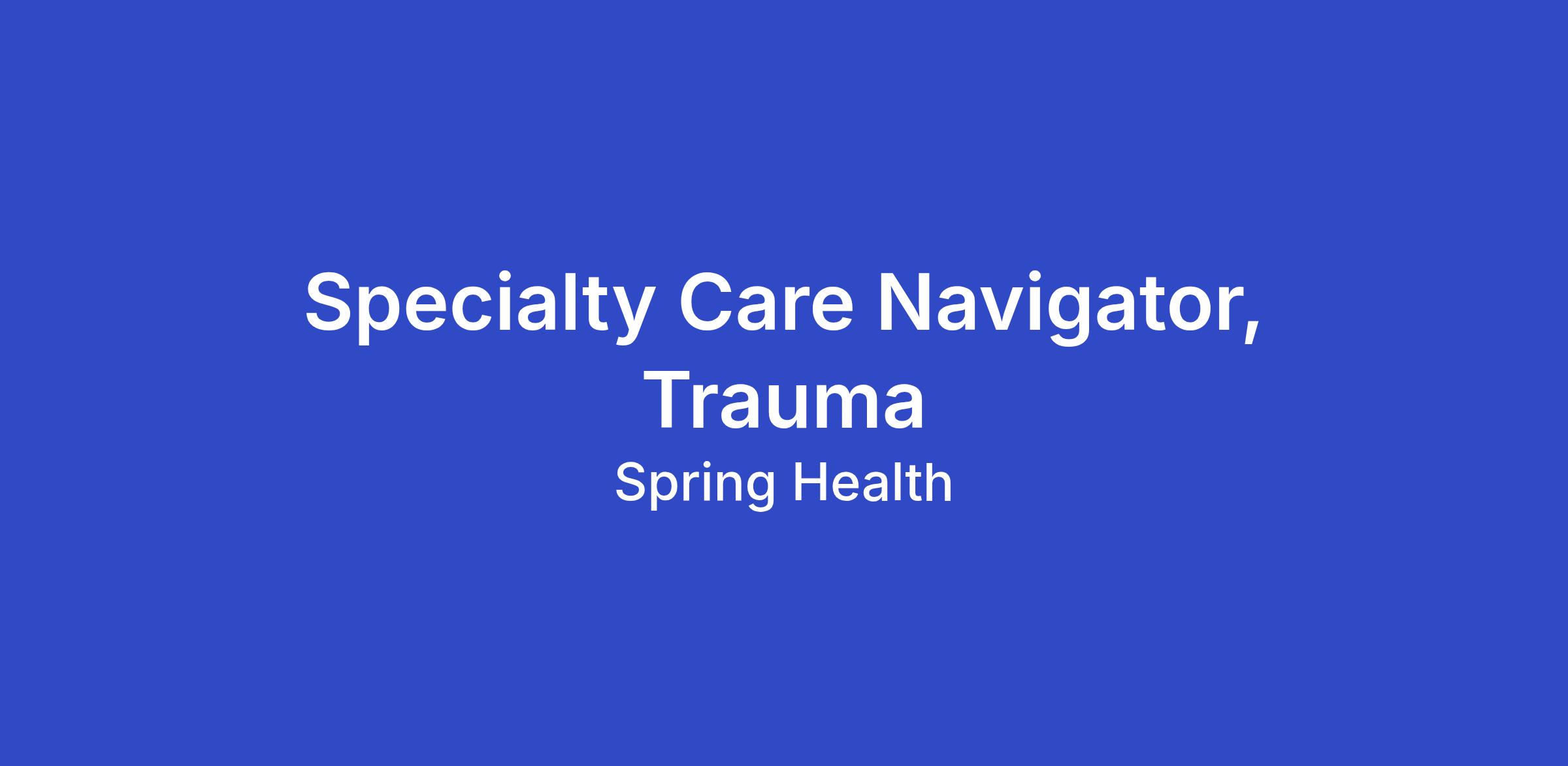 We're currently looking for an independently licensed mental health professional to join the Care Navigation team (LCSW, LMFT, LPC required) to support adult and adolescent members seeking support with posttraumatic stress disorder (PTSD) and complex trauma. Reporting to the clinical lead of the Trauma Specialty Care Program, the Trauma Specialty Care Navigator will provide initial assessment, support, referral, and ongoing care coordination for members within Spring Health’s innovative Trauma program. The role may also support teens 13 to 17 and their caregivers.