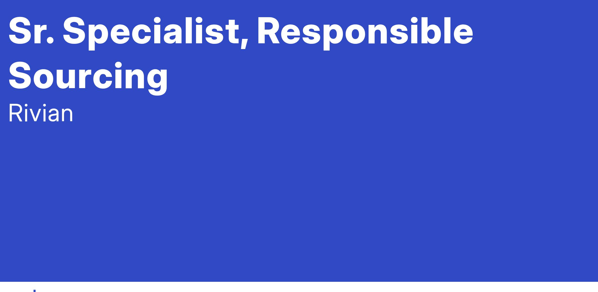 As the Senior Specialist of Responsible Sourcing, you will contribute to the execution of Rivian’s Responsible Sourcing program and initiatives, and will be engaged with the various cross functional teams and key business partners to deliver the company’s sustainability objectives. You will support implementing and monitoring social and environmental goals and strategies across the supply chain, including both the integrated manufacturing locations as well as the contracted supply chain. This is an excellent opportunity to help build and execute Responsible Sourcing throughout Rivian’s value chain (including supply chain labor, human rights, ethics, responsible business practices, and environment). The role reports directly to the Senior Director of Sustainability and must be able to commute to a Rivian office on a hybrid schedule (locations include Irvine, CA, Palo Alto, CA, Plymouth, MI, Atlanta, GA, Normal, IL).