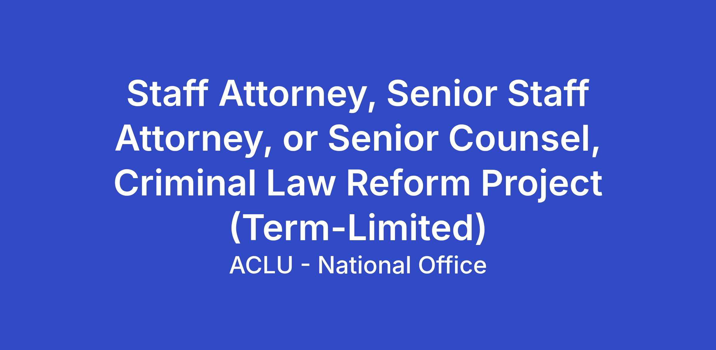 The ACLU seeks applicants for the full-time position of Staff Attorney, Senior Staff Attorney, or Senior Counsel in the Criminal Law Reform Project of the ACLU’s National office in New York, NY, San Francisco, CA, or Washington, DC. This is a hybrid role that has in-office requirements of two (2) days per week or eight (8) days per month.