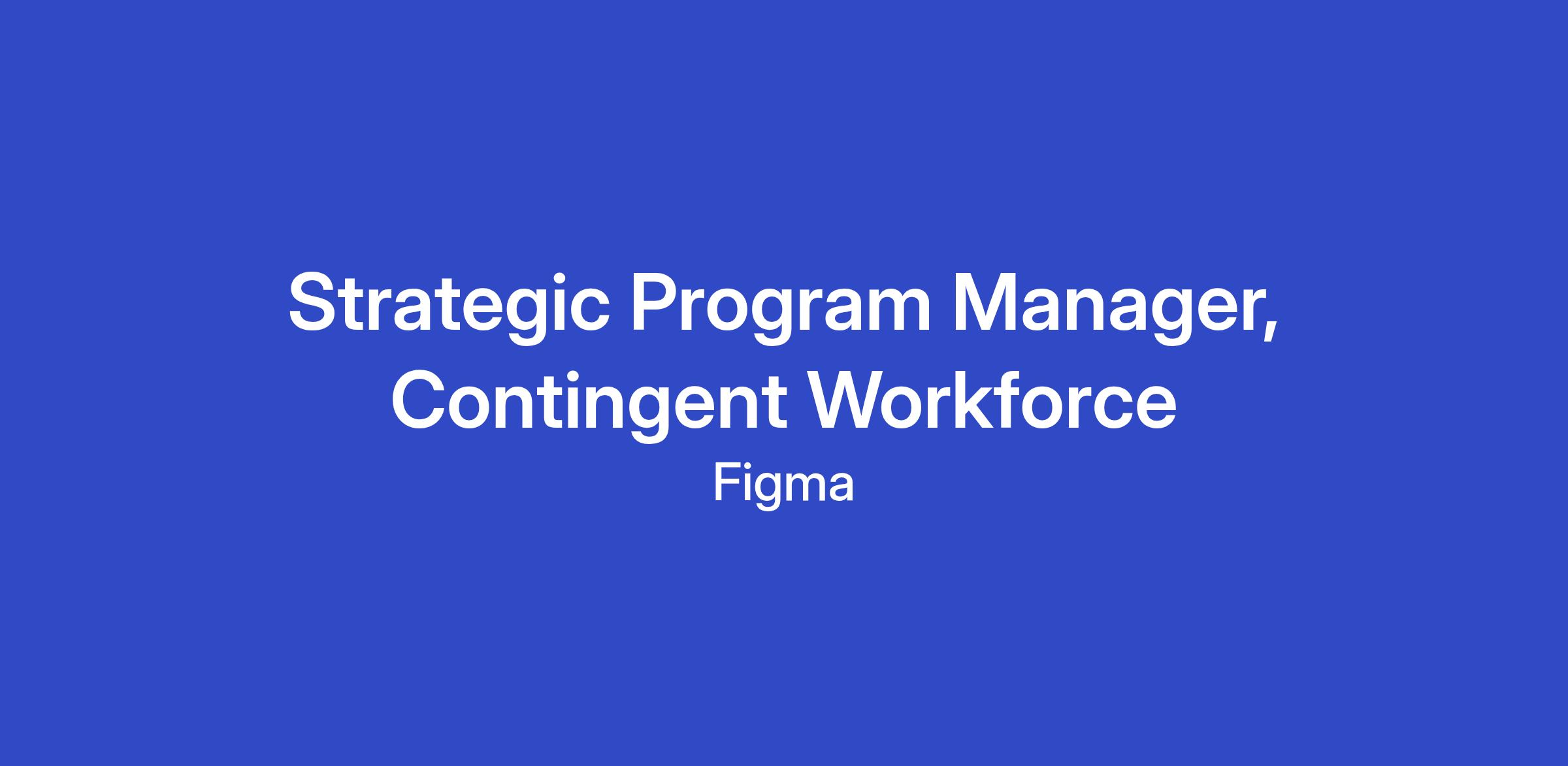 As Figma continues to grow, so does the talented community of folks who help us build, support, and scale our products. Our contingent workforce plays an important part in that mission—and we’re ready to uplevel how we partner with and support this part of our team. The Strategic Program Manager for Contingent Workforce will design and run the systems, processes, and strategies that empower Figmates and contingent partners alike to do their best work. You’ll work across People, Legal, Finance, Security, and teams all across Figma to craft a thoughtful, flexible, and compliant workforce ecosystem. This role is perfect for someone who loves solving complex puzzles, building clarity in ambiguity, and designing programs that scale with heart.