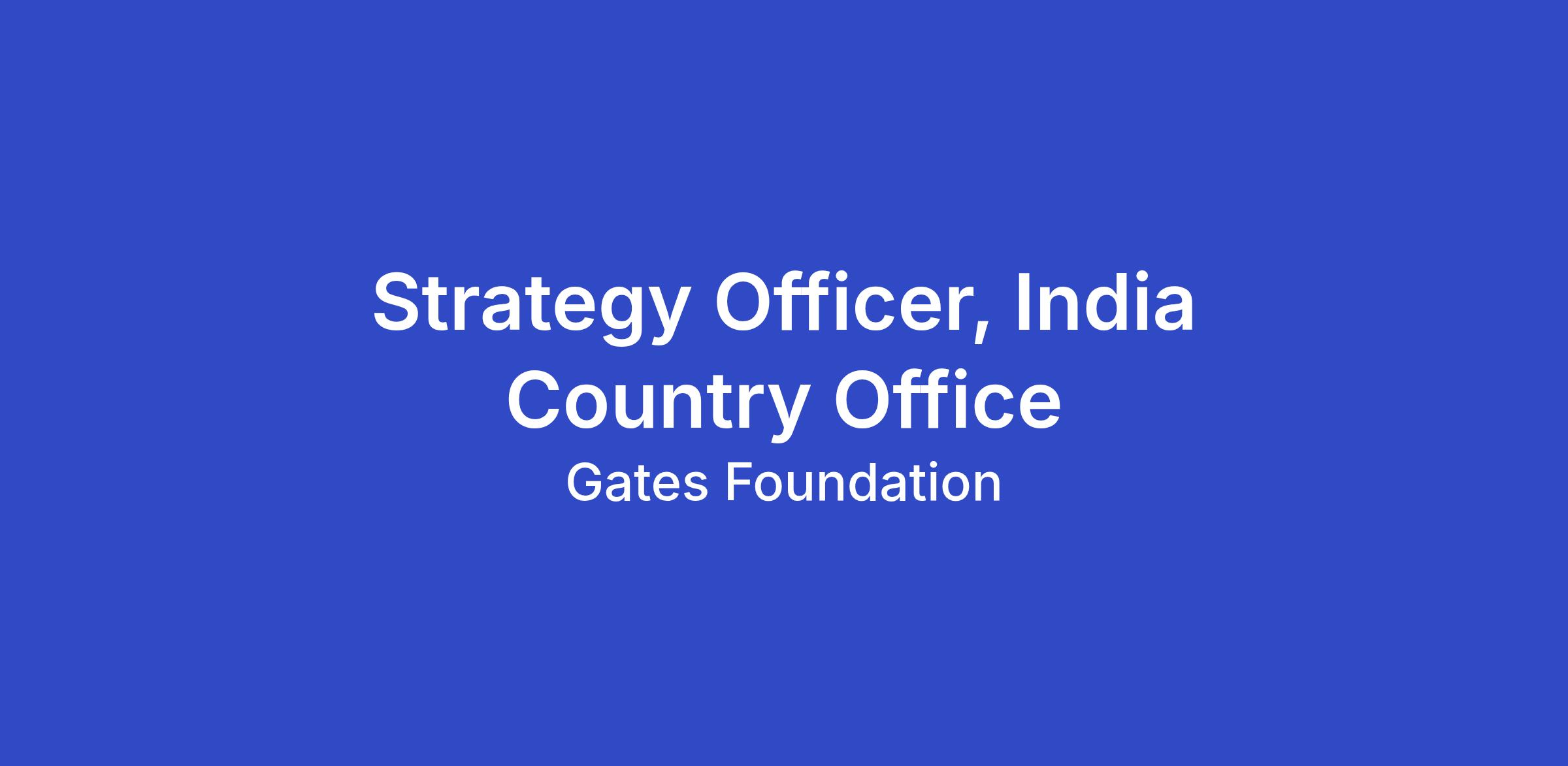 Located in New Delhi, the Strategy Officer (SO), India Country Office will lead high-impact strategy projects in collaboration with program leadership and develop processes for effective portfolio/investment execution against the approved strategy. The SO will work directly and often independently with executive sponsors of projects - Program Directors and Deputy Directors - and team members across all levels to shape strategies and implementation. Potential projects span strategy development for current initiative areas; tracking and analyzing emerging global and national trends to inform portfolio strategies; leading on deliverables and project management for foundation-level strategy reviews and annual planning; identification of thematic challenges and strategic options; facilitation of investment making processes, portfolio-level prioritization and trade-off discussions; making and managing investments to synthesize data and evidence used to inform strategies; and the strategic application of innovation to our work.