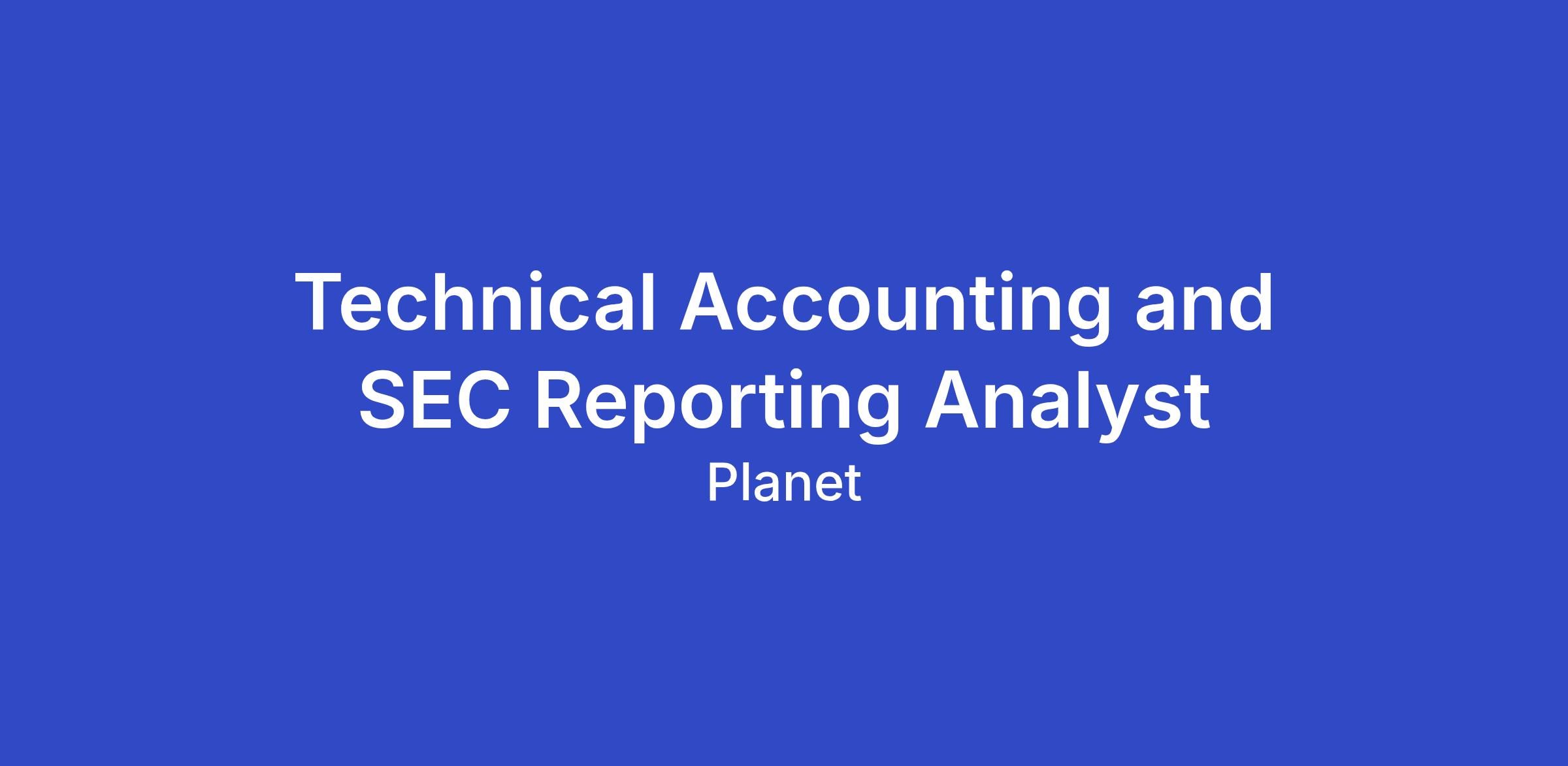 The Accounting team at Planet is seeking an extremely motivated and experienced Technical Accounting and SEC Reporting Analyst as we continue to scale and grow. As a Technical Accounting and SEC Reporting Analyst at Planet, you are someone who is able to roll up your sleeves for hands-on experience supporting the financial reporting process for a company that creates meaningful change. You will play a critical role in developing and implementing accounting policies, enhancing our financial reporting processes, and building a strong technical accounting foundation. This role will work closely with cross-functional teams and external auditors to ensure accuracy, compliance, and transparency in our financial reporting. To be successful in this role, you must have excellent accounting knowledge, pay attention to detail, and embrace challenges as opportunities for success to expand and grow with the company.