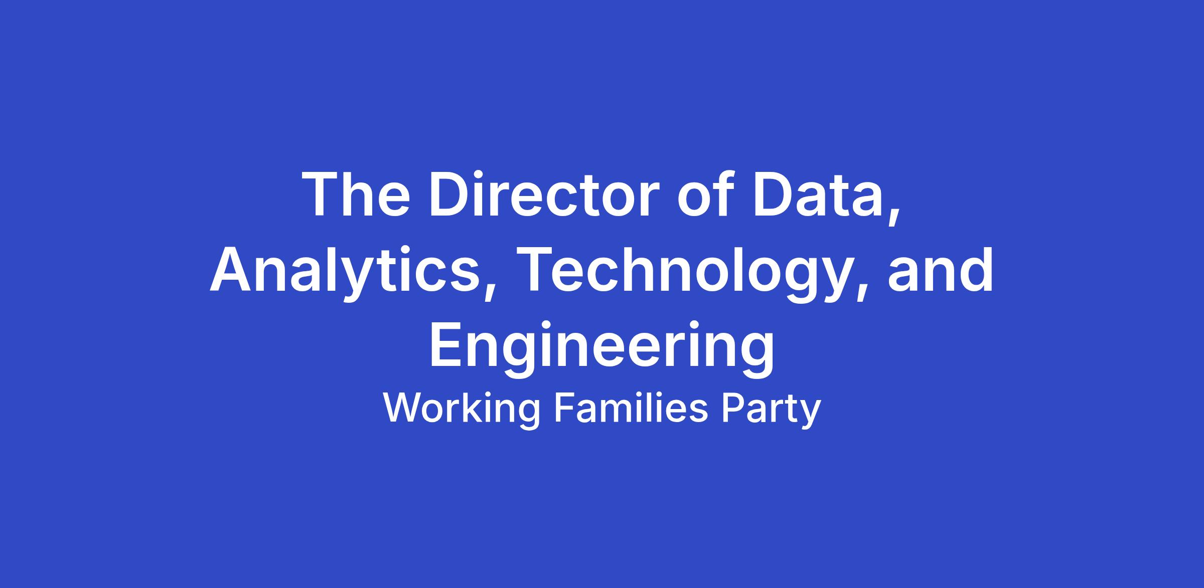 The Director of Data, Analytics, Technology, and Engineering is responsible for turning Working Families Party and Working Families Power priorities into clear, actionable work for the Director of Data, Analytics, Technology, and Engineering Department (Data Department) and making sure that work gets done well.