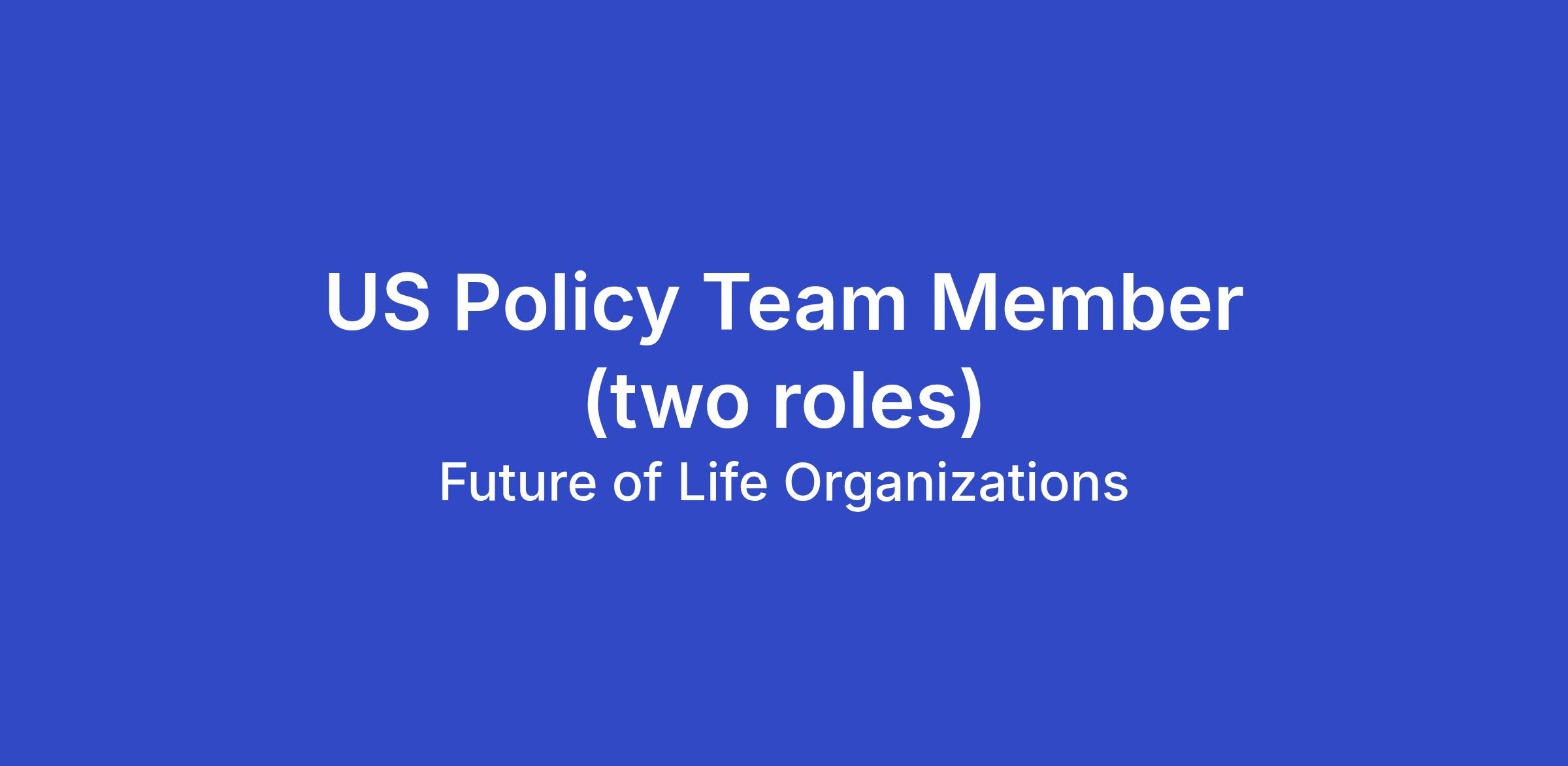 The Future of Life Institute (FLI) is hiring two US Policy Team Members to help with our policy work and US government engagement to promote the safe governance of AI through a bipartisan lens. The US Policy Team Members will report directly to the Head of U.S. Policy.