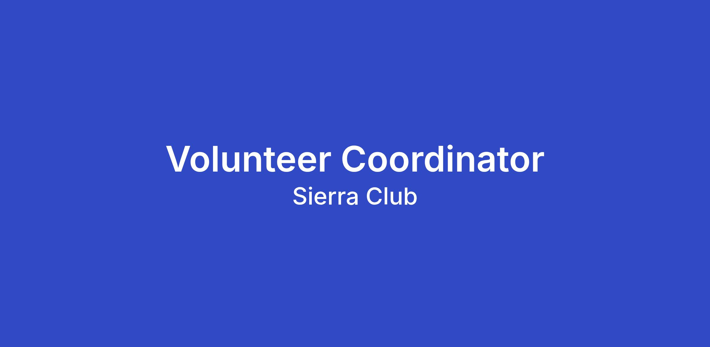 - Volunteer Coordination: Engage in all aspects of the volunteer experience from recruitment, interviewing, placement, and onboarding to project assignment, work plan development, and oversight. Support volunteers to accomplish their goals, coach volunteers on skills, and coordinate activities to assure advancement of the Sierra Club's priorities. Foster a healthy volunteering culture. Coordinate and plan volunteer activities, events, and mobilization tactics supporting the Sierra Club's priorities.